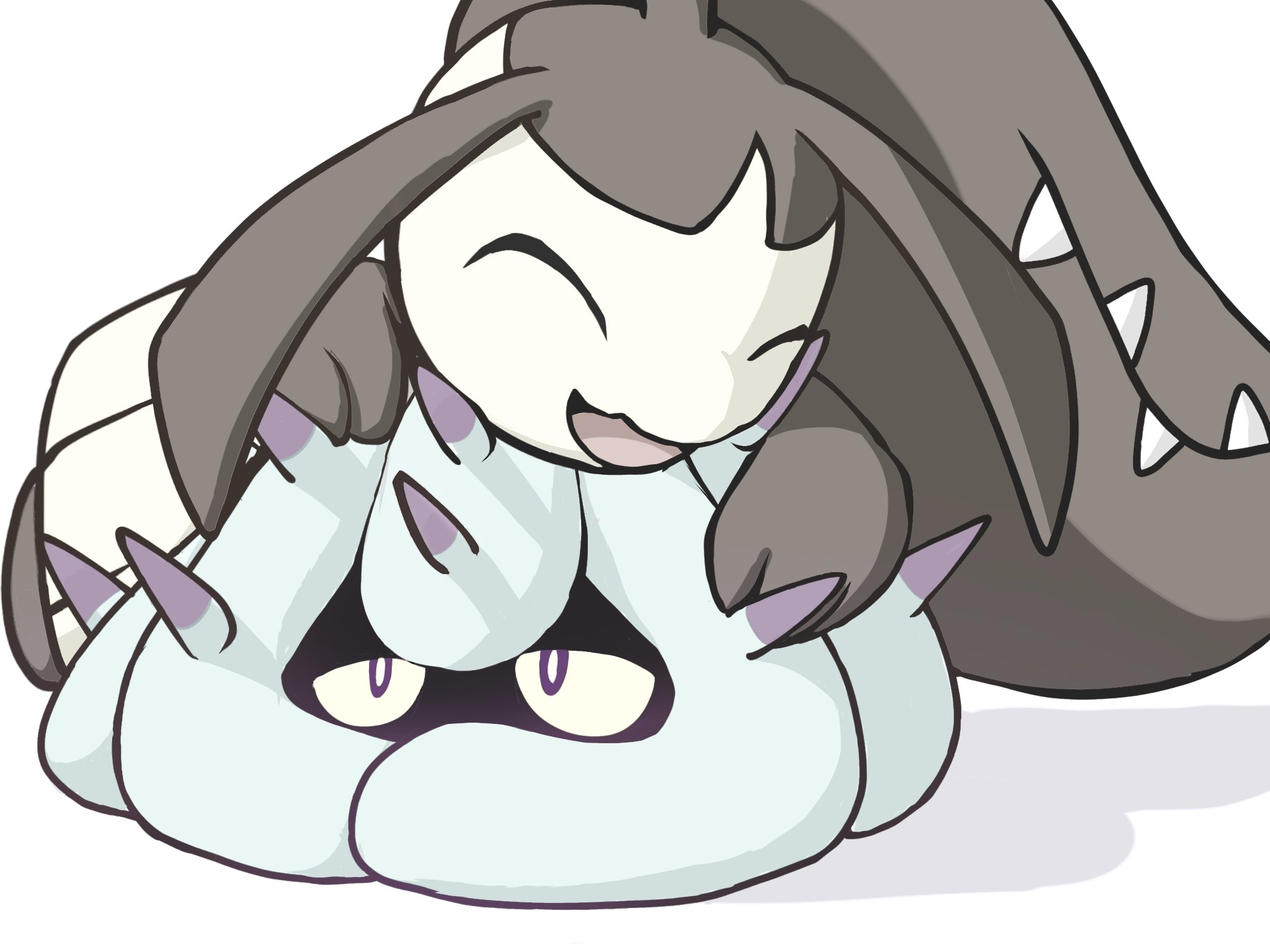 1girl ^_^ big_hair closed_eyes extra_mouth eyes_in_shadow female_focus gen_3_pokemon gen_7_pokemon half-closed_eyes happy highres long_hair mareanie mawaifu mawile muted_color nintendo open_mouth pokemon pokemon_(creature) sharp_teeth simple_background smile spikes teeth tentacles very_long_hair white_background