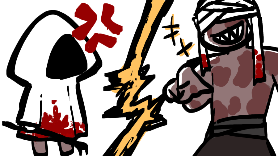 +++ 1boy 1girl adashino_adami anger_vein bandaged_hand bandages blood blood_on_clothes bloody_bandages commentary_request crowbar deformed grin holding holding_crowbar homicipher hood hood_up mr._machete official_style platina_(pla_vtuber) pointing raincoat sharp_teeth simple_background skirt smile split_screen teeth topless_male white_background white_raincoat