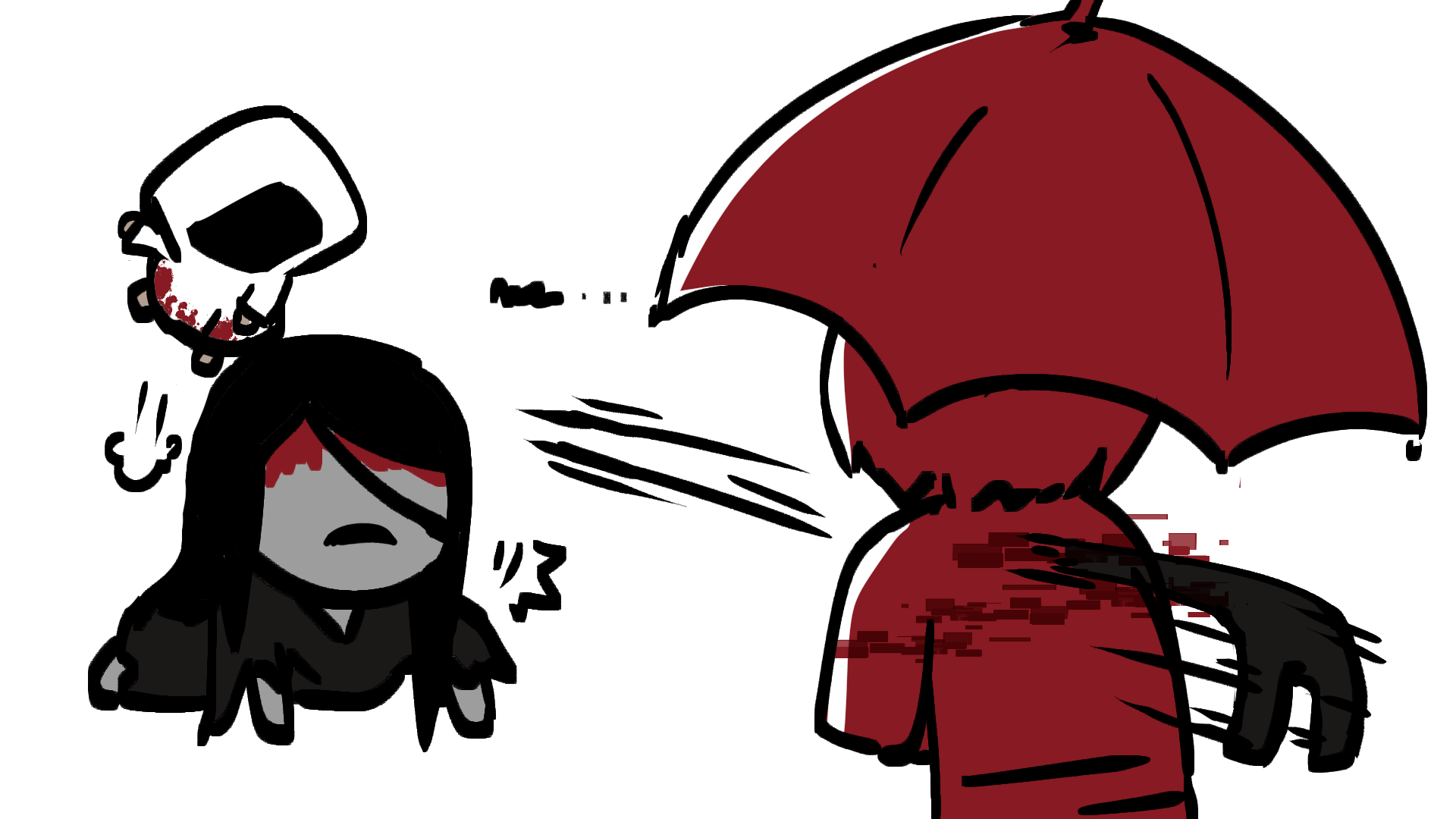 1girl 2boys adashino_adami black_hair black_kimono coat commentary_request crowbar failure glitch highres holding holding_umbrella homicipher japanese_clothes kimono long_hair mr._crawling mr._scarletella multiple_boys official_style platina_(pla_vtuber) raincoat red_coat red_hair red_umbrella short_hair simple_background throwing umbrella white_background white_raincoat