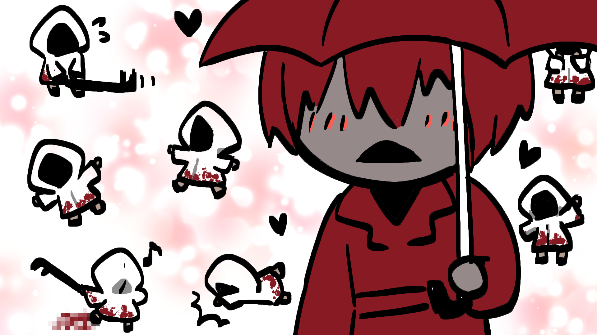 1boy 1girl adashino_adami blood blood_on_clothes blush coat commentary_request crowbar heart hetero highres holding holding_crowbar holding_umbrella homicipher mr._scarletella multiple_views official_style platina_(pla_vtuber) raincoat red_coat red_hair red_umbrella short_hair umbrella white_raincoat