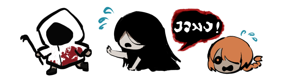1girl 2boys adashino_adami black_hair black_kimono blood blood_on_clothes braid chibi commentary_request crowbar flying_sweatdrops holding holding_crowbar homicipher homicipher_text hood hood_up japanese_clothes kimono long_hair mr._chopped mr._crawling multiple_boys official_style orange_hair platina_(pla_vtuber) raincoat running simple_background white_background white_raincoat