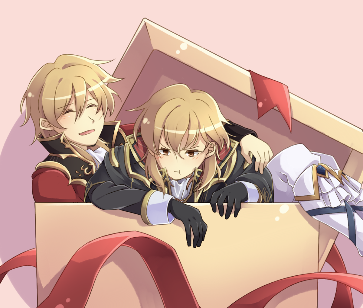 2boys :t ares_(fire_emblem) arm_around_shoulder ascot black_cape black_coat black_gloves blonde_hair blush boots box cape closed_eyes coat collared_cape eldigan_(fire_emblem) father_and_child father_and_son fire_emblem fire_emblem:_genealogy_of_the_holy_war gift gift_box gloves gold_trim hair_between_eyes high_collar in_box in_container knee_boots laughing long_hair long_sleeves male_focus melcabcd multiple_boys nintendo open_box open_mouth pants parent_and_child pink_background popped_collar pout red_coat red_ribbon ribbon simple_background v-shaped_eyebrows white_ascot white_footwear white_pants wolf_cut