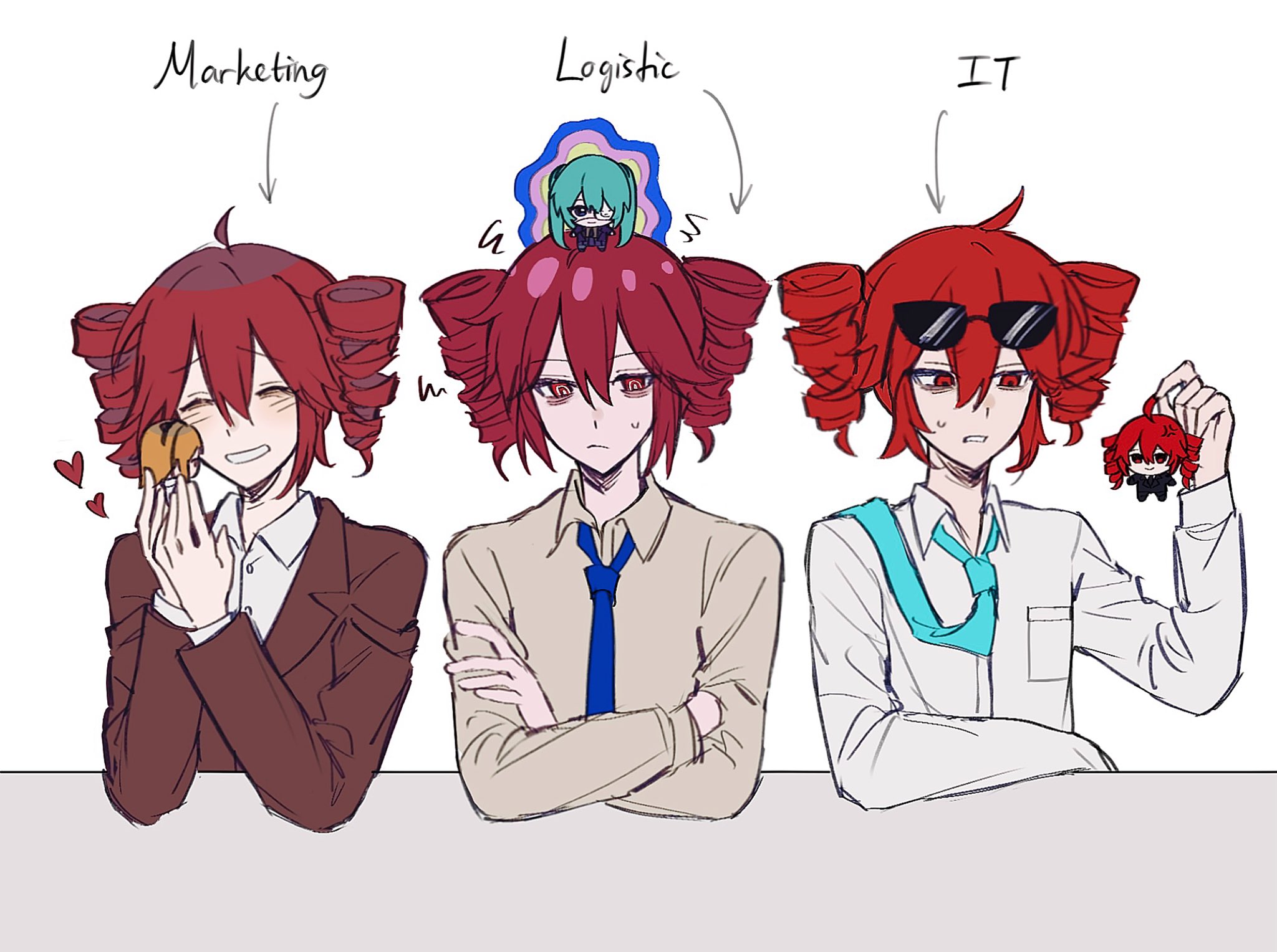 6+girls a.i._voice adachi_rei ahoge ahoge_grab ataman_ita_(synthesizer_v) black_jacket black_necktie black_skirt black_suit blue_hair blue_necktie breast_pocket buttons chibi clenched_teeth closed_mouth drill_hair dual_persona eyepatch eyewear_on_head flat_chest formal_clothes hair_between_eyes hatsune_miku highres holding holding_mini_person jacket kasane_teto kikai_shoujo_to_misoji_ol_(utau) liar_dancer_(synthesizer_v) long_sleeves looking_at_another medical_eyepatch mini_person monitoring_(vocaloid) multiple_girls necktie office_lady orange_hair pocket red_eyes red_hair school_uniform shirt simple_background skirt suit sunglasses table teeth three-quarter_sleeves twin_drills twintails ultra_trailer_(synthesizer_v) utau vocaloid white_background white_shirt wing_collar xom0meku