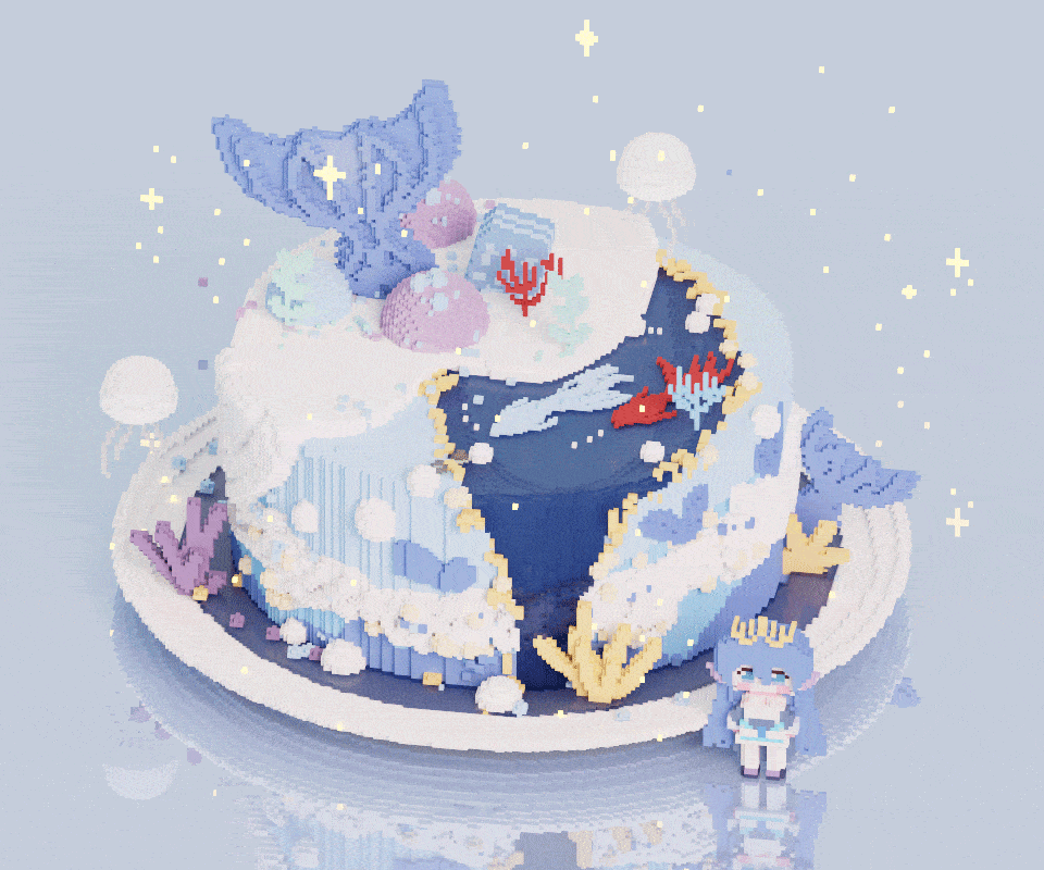1girl animated animated_gif artist_request birthday_cake blue_eyes blue_hair blush cake chibi coral_reef crown duel_monster fins fish fish_tail food hair_between_eyes kitkallos_(yu-gi-oh!) light_particles non-web_source plate reflection standing star_(symbol) tail tearlaments_kitkallos yu-gi-oh!