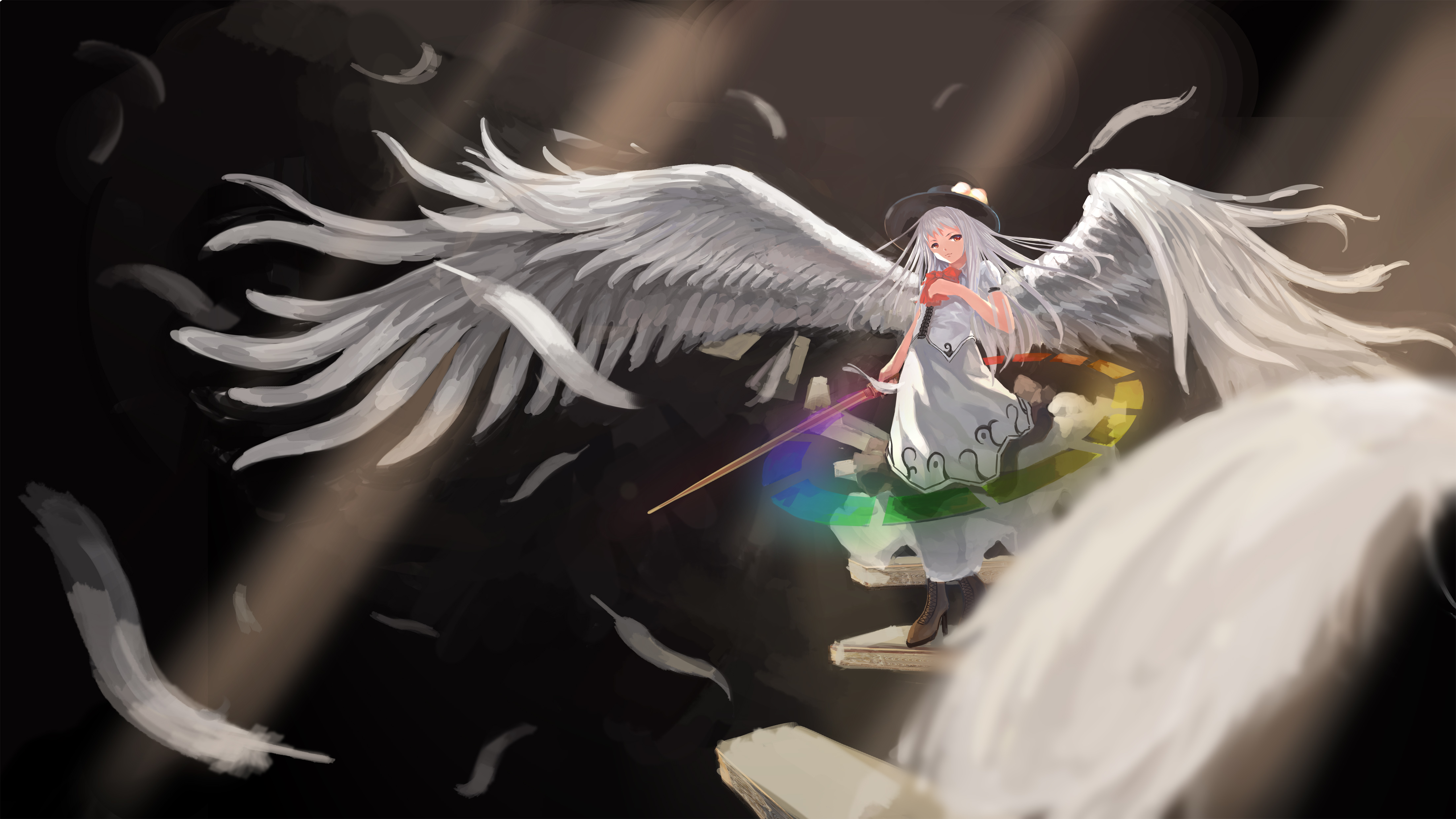 1girl absurdres alternate_hair_color black_hat blurry blurry_background boots commentary dress feathers full_body g-tenko-r hat highres hinanawi_tenshi holding holding_sword holding_weapon light_rays m.u.g.e.n peach_hat_ornament qghy solo sword weapon white_dress white_feathers white_wings wings
