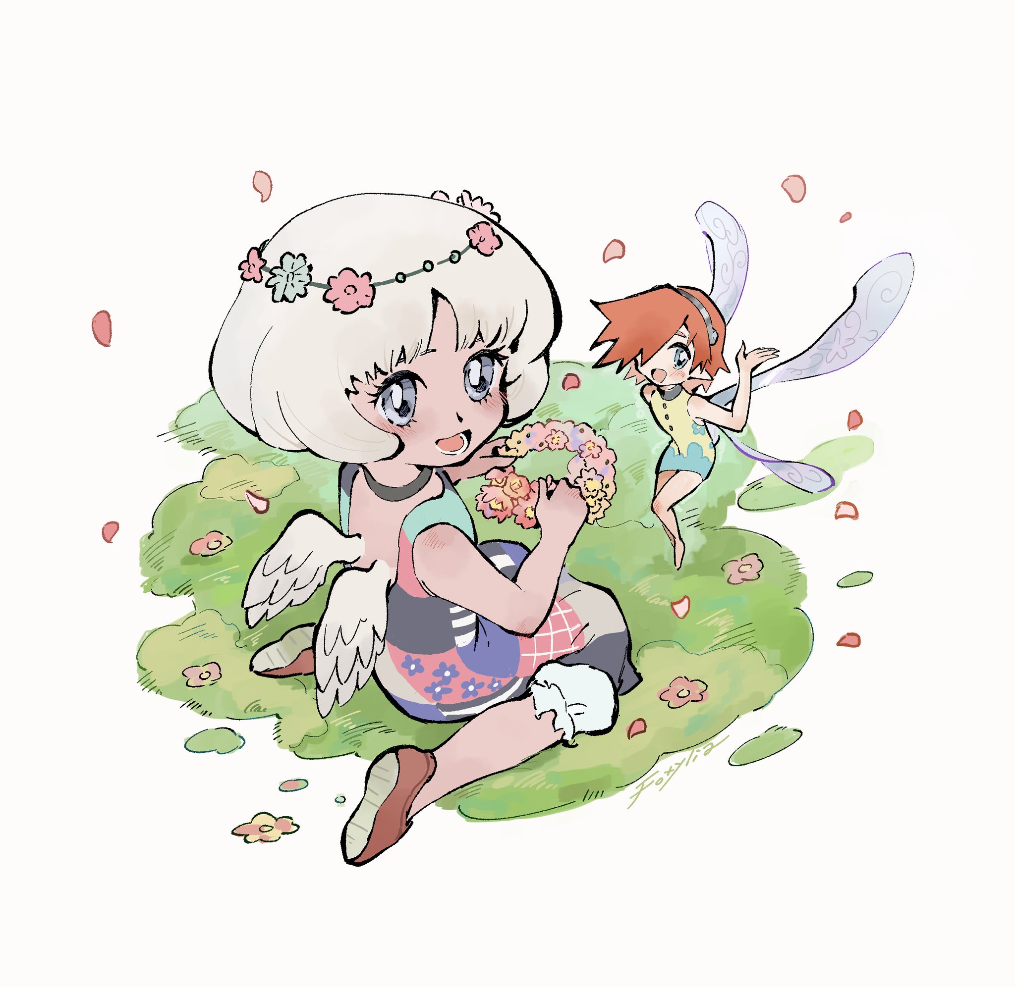 2girls angel_wings bright_pupils brown_hair commentary fairy fairy_wings flower_wreath foxylia324324 from_above gallica_(metaphor:_refantazio) grey_eyes hair_over_one_eye head_wreath highres holding holding_wreath looking_at_viewer maria_(metaphor:_refantazio) metaphor:_refantazio multiple_girls open_mouth short_hair simple_background sitting smile wariza white_background white_hair white_pupils wings