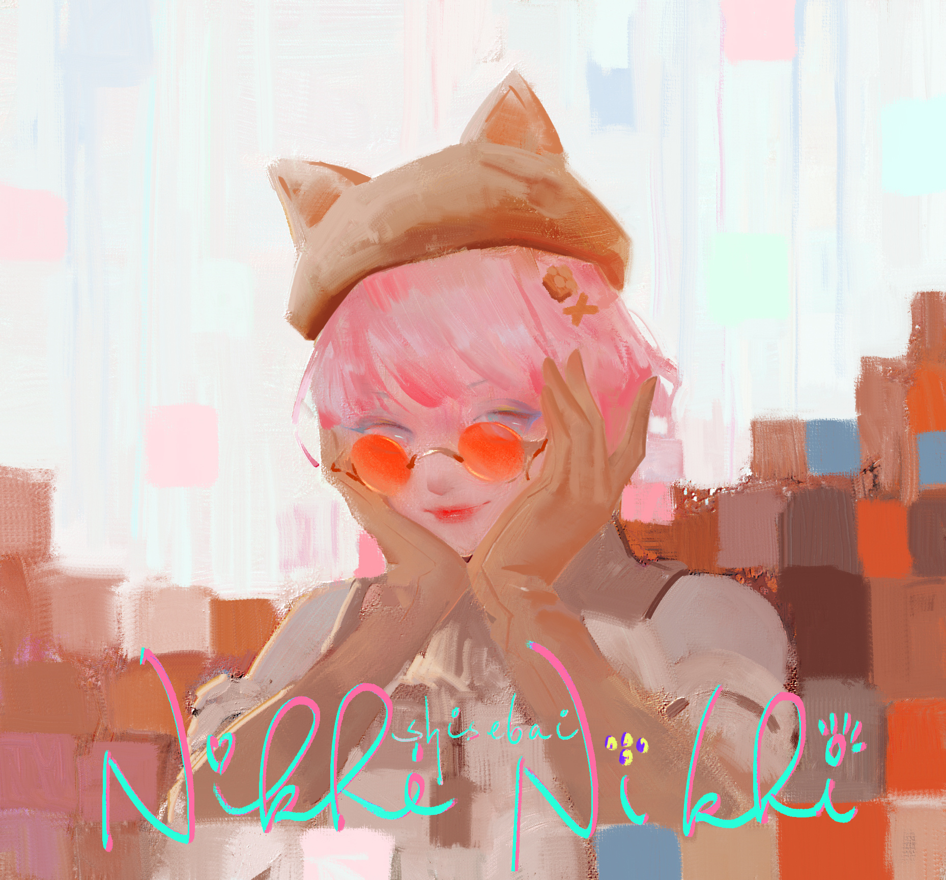 1girl animal_ear_headwear animal_ears artist_name beret blue_eyeliner blue_eyes brown-framed_eyewear brown_background brown_gloves brown_hat cat_ears chinese_commentary closed_mouth colored_eyelashes commentary_request elbow_gloves eyeliner fake_animal_ears frilled_sleeves frills gloves grid_background hair_ornament hairclip hands_on_own_cheeks hands_on_own_face hat highres infinity_nikki lipstick lyrics makeup nikki_(series) orange-tinted_eyewear paw_hair_ornament pink_hair red_lips ribbon-trimmed_sleeves ribbon_trim round_eyewear shi_sebai_haoyun_lailailai shirt short_hair short_sleeves smile solo sunglasses tinted_eyewear two-tone_background upper_body white_background white_shirt x_hair_ornament