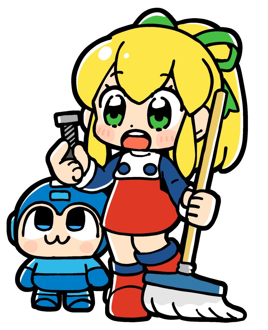 1boy 1girl :3 android bkub blonde_hair blue_bodysuit blue_eyes blue_footwear blue_helmet blush_stickers bodysuit boots broom chibi closed_mouth dot_nose dress full_body green_eyes green_ribbon hair_between_eyes hair_ribbon helmet holding holding_broom long_hair long_sleeves looking_at_object mega_man_(character) mega_man_(classic) mega_man_(series) open_mouth ponytail red_dress red_footwear ribbon roll_(mega_man) screw sidelocks simple_background teeth upper_teeth_only white_background