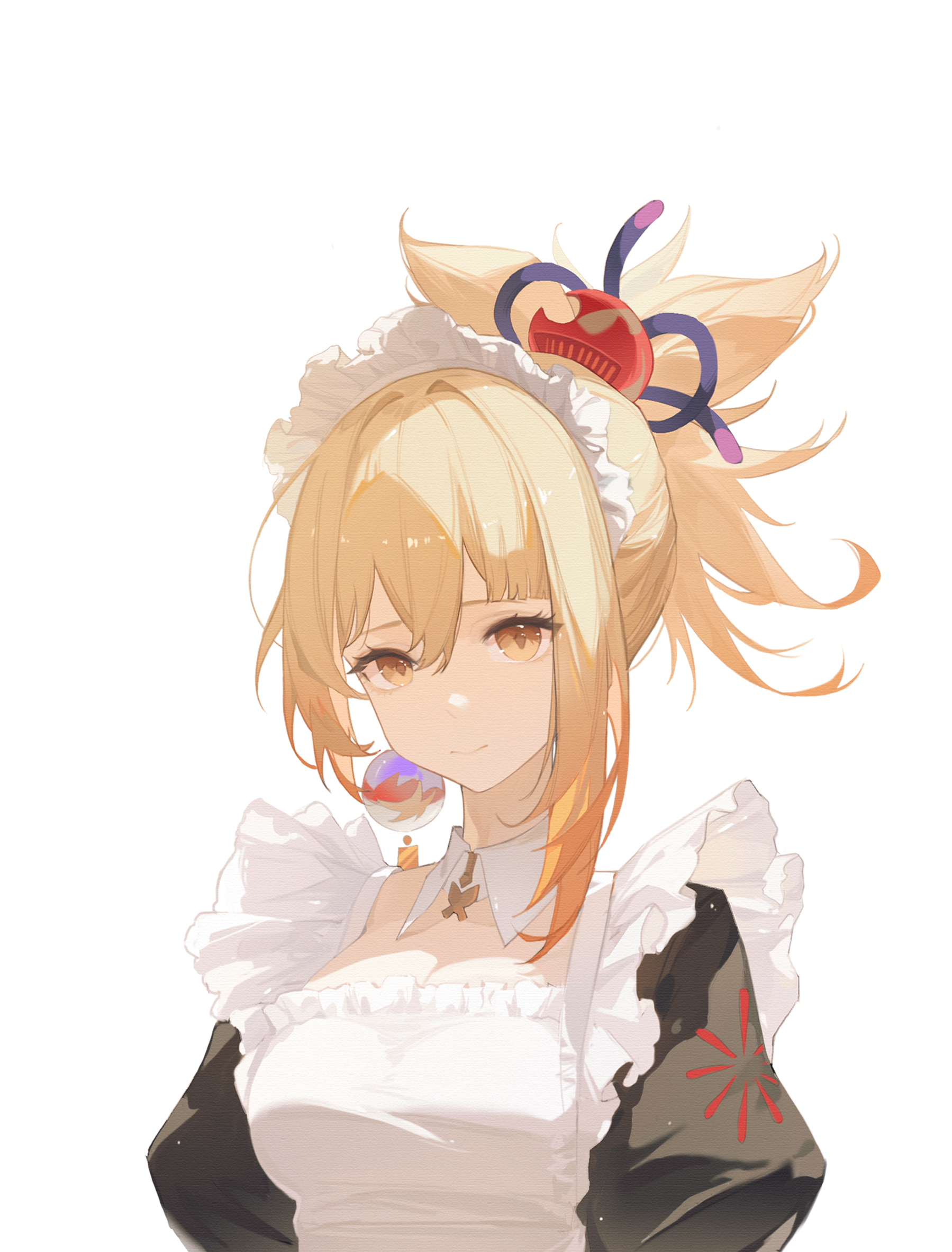 1girl alternate_costume apron blonde_hair breasts chinese_commentary closed_mouth commentary_request genshin_impact highres large_breasts looking_at_viewer maid maid_headdress portrait puffy_sleeves simple_background solo white_apron white_background wjx724888319 yellow_eyes yoimiya_(genshin_impact)