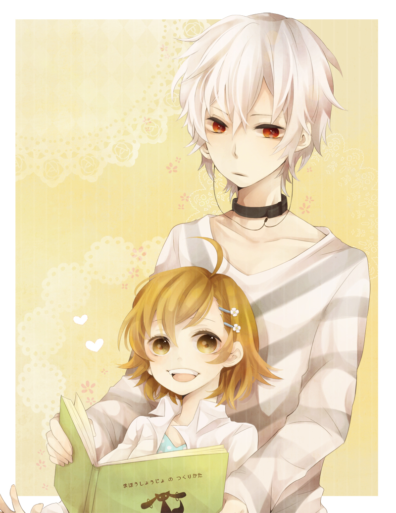 10s accelerator_(toaru_majutsu_no_index) ahoge albino bad_id bad_pixiv_id book brown_eyes brown_hair child choker hair_ornament hairclip heart ichinose_(sorario) kyubey last_order_(toaru_majutsu_no_index) mahou_shoujo_madoka_magica mahou_shoujo_madoka_magica_(anime) open_book open_mouth reading red_eyes shirt short_hair smile striped_clothes striped_shirt toaru_majutsu_no_index white_hair