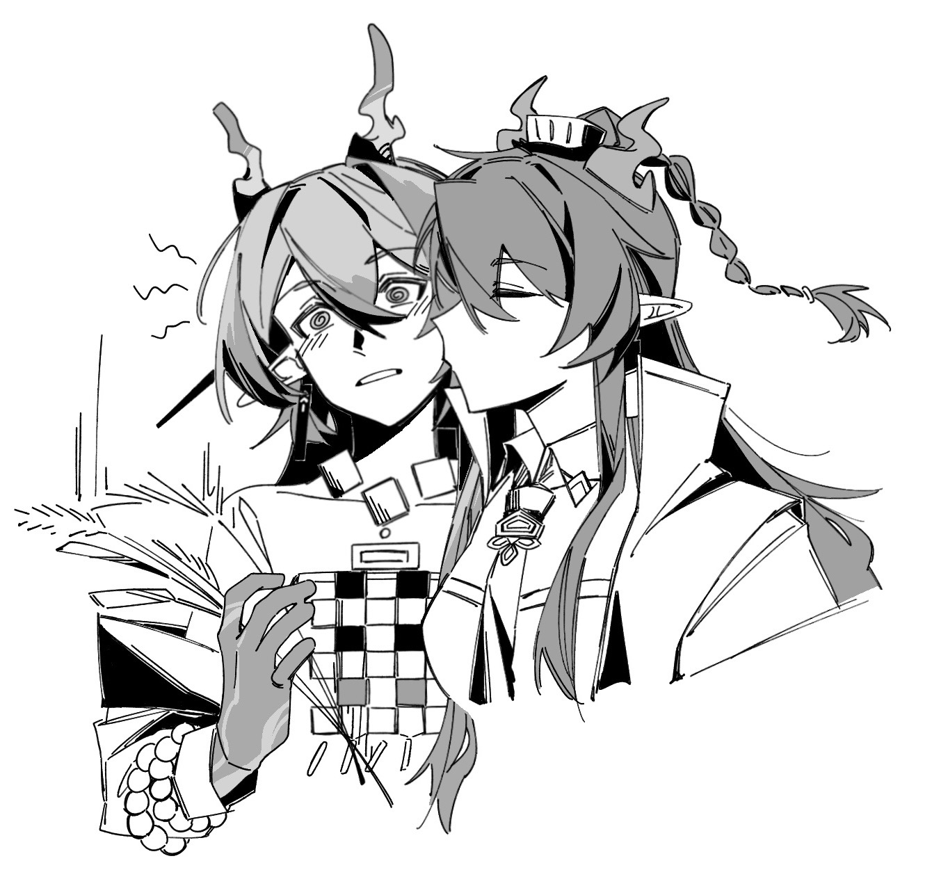 2girls @_@ arknights beads closed_eyes cropped_torso dragon_girl dragon_horns flustered greyscale hair_between_eyes highres holding holding_plant horns incest kiss ling_(arknights) long_hair monochrome multiple_girls plant profile qianxidasuan_(suan_wu_cao) shu_(arknights) siblings simple_background sisters sketch wheat white_background yuri