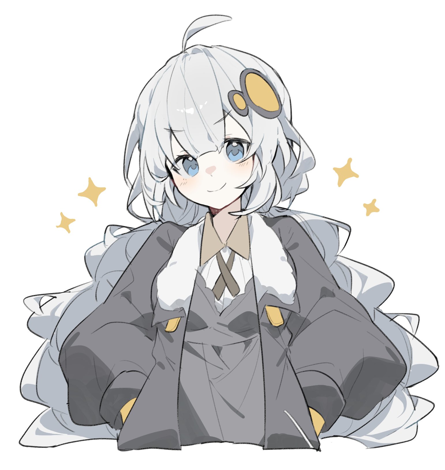 1girl ahoge black_coat black_dress blue_eyes coat commentary_request cropped_torso dress hair_ornament hands_in_pockets highres kizuna_akari long_sleeves nonaa4141 simple_background smile solo voiceroid white_background white_hair
