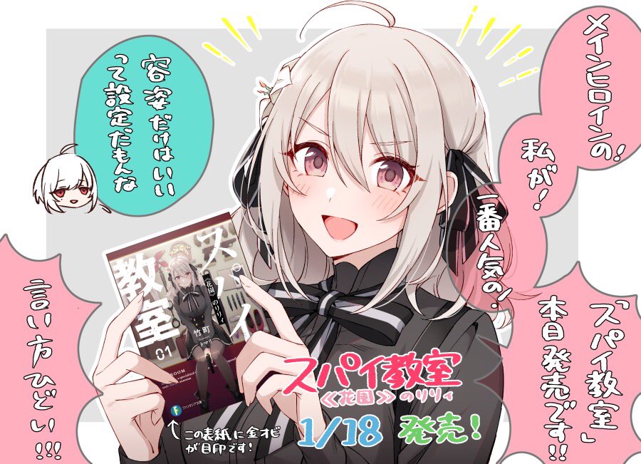 1girl :d ahoge black_ribbon blouse blush book chibi commentary_request flower grey_hair grey_shirt hair_flower hair_ornament hair_ribbon hands_up holding holding_book lily_(spy_kyoushitsu) looking_at_viewer medium_hair official_art open_mouth red_eyes ribbon shirt smile solo_focus speech_bubble spy_kyoushitsu tomari_(veryberry00) translation_request