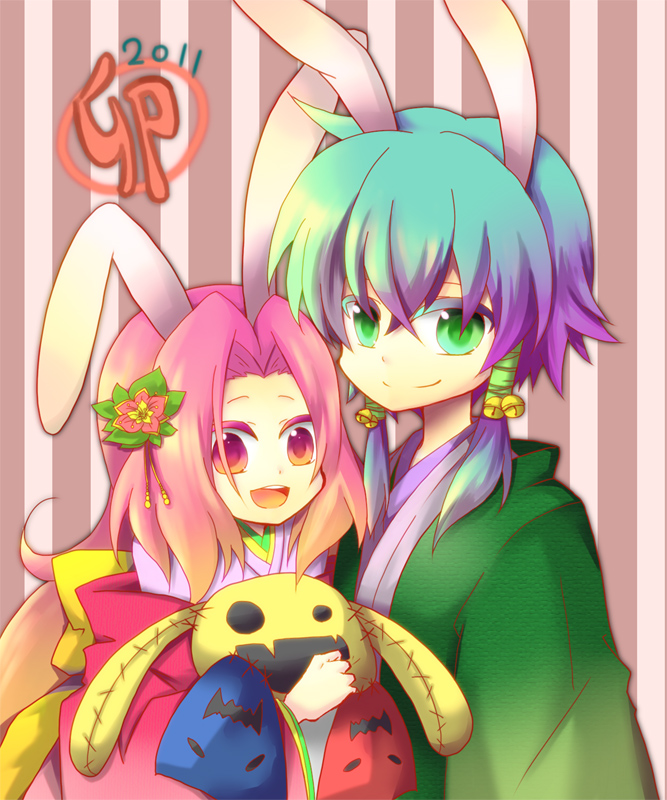 00s 1boy 1girl animal_ears arietta_(tales) couple flower gradient_hair green_eyes green_hair hair_flower hair_ornament hakama hakama_skirt happy hetero ion_(tales) japanese_clothes ms. multicolored_hair orange_hair pink_eyes pink_hair purple_hair rabbit_ears short_hair_with_long_locks sidelocks skirt smile stuffed_toy tales_of_(series) tales_of_the_abyss