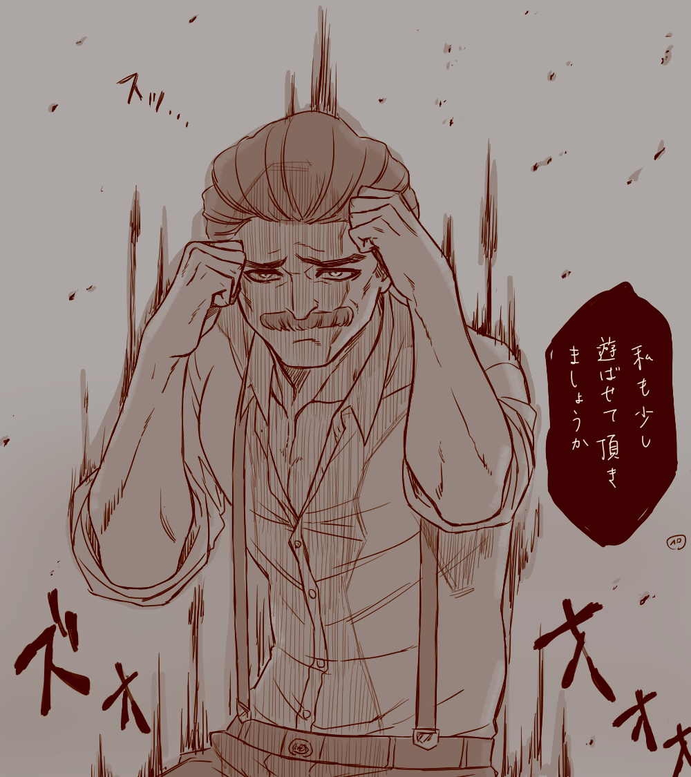 1boy aman_(dqb2) clenched_hands commentary_request dragon_quest dragon_quest_builders_2 facial_hair fighting_stance greyscale imminent_attack looking_at_viewer male_focus marisuke_(marippe) mature_male monochrome muscular muscular_male mustache partially_shaded_face pectoral_cleavage pectorals short_hair sketch sleeves_rolled_up solo suspenders translation_request upper_body