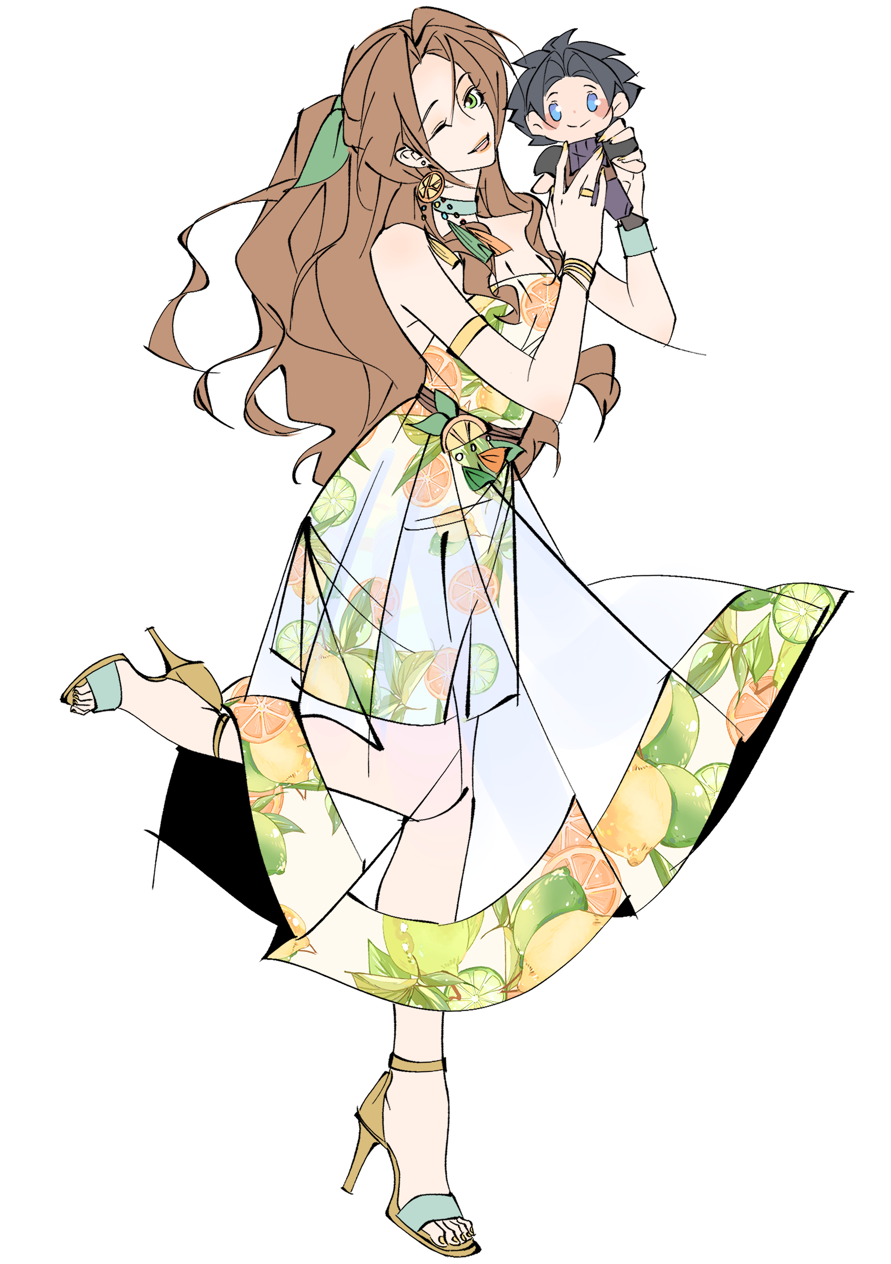 1girl absurdres aerith_gainsborough aerith_gainsborough_(citric_dress) bare_shoulders black_hair blue_eyes blush brown_hair character_doll doll dress earrings final_fantasy final_fantasy_vii final_fantasy_vii:_ever_crisis full_body green_eyes green_ribbon hair_ribbon hashtag-only_commentary high_heel_sandals high_heels highres holding holding_doll jewelry long_hair mianmian741 one_eye_closed parted_bangs ribbon sandals see-through_clothes see-through_skirt skirt smile standing standing_on_one_leg white_background zack_fair