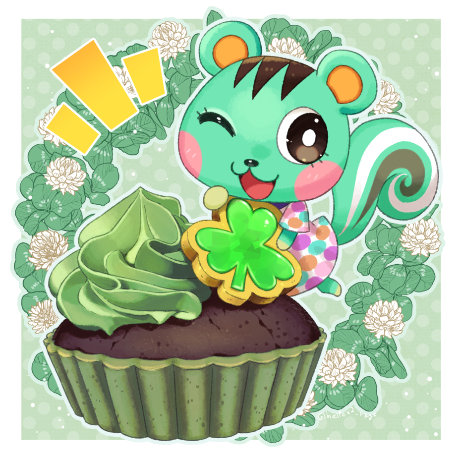 1girl ;3 animal_crossing aqua_dress aqua_fur black_eyes border bright_pupils chibi chibikemo cupcake dessert dress food furry green_background grey_outline hand_rest hand_up happy knee_up looking_to_the_side lower_eyelashes_only mini_person minigirl mint_(animal_crossing) mint_chocolate multicolored_dress nintendo one_eye_closed open_mouth orange_dress outline patterned_clothing pink_dress polka_dot polka_dot_background short_sleeves sideways_glance solo squirrel_girl tsutsuji_(hello_x_2) white_border white_dress white_pupils