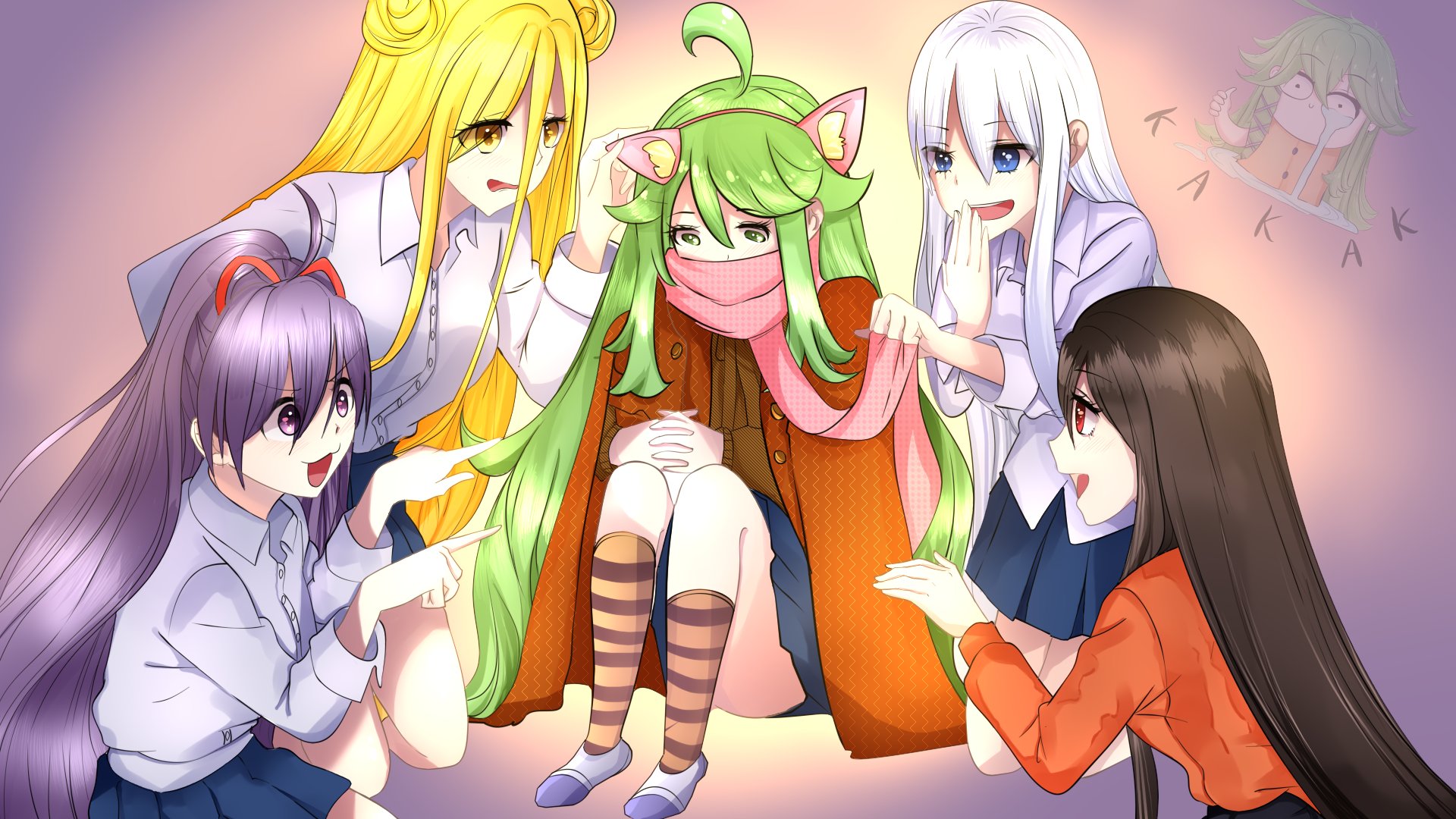 5girls animal_ears black_hair blonde_hair blue_eyes cat_ears date_a_live female_focus hair_bun highres hoshimiya_mukuro kakak kyouno_natsumi long_hair multiple_girls purple_eyes purple_hair red_eyes ribbon skirt socks tobiichi_origami tokisaki_kurumi white_hair yatogami_tohka yellow_eyes