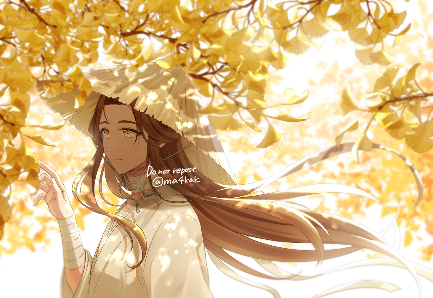 1boy arm_at_side backlighting bandaged_neck bandaged_wrist bandages bishounen blurry blurry_background branch brown_hair chinstrap chinese_clothes choppy_bangs closed_mouth dappled_sunlight day fingernails floating_hair forest ginkgo_leaf ginkgo_tree hair_over_shoulder half-closed_eyes hand_up hanfu happy hat leaf light_smile limited_palette long_hair male_focus nature outdoors parted_bangs rice_hat shade ssk_(yoiosushi) straight_hair sunlight tianguan_cifu tree tree_shade tsurime twitter_username upper_body very_long_hair white_hanfu white_theme xie_lian yellow_eyes yellow_leaves yellow_theme