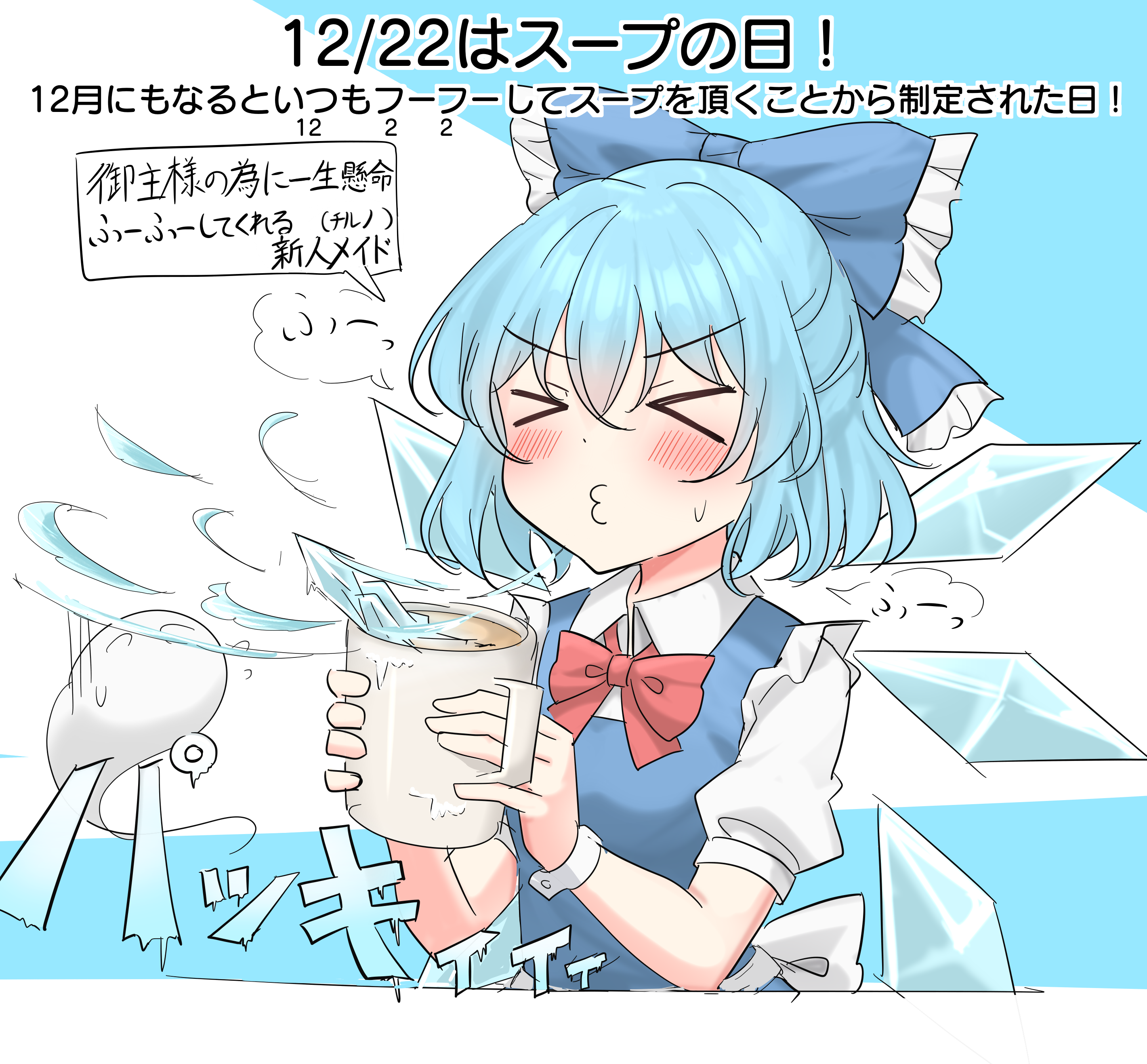 >_< 1girl absurdres adapted_costume blowing blue_bow blue_dress blue_hair blush bow bowtie cirno collared_shirt commentary_request cryokinesis cup detached_wings dress frilled_bow frills hair_between_eyes hair_bow highres hitodama holding holding_cup ice ice_wings konpaku_youmu konpaku_youmu_(ghost) mug o3o open_mouth puffy_short_sleeves puffy_sleeves red_bow red_bowtie shirt short_sleeves sweatdrop touhou translation_request wings wrist_cuffs youyume-kun