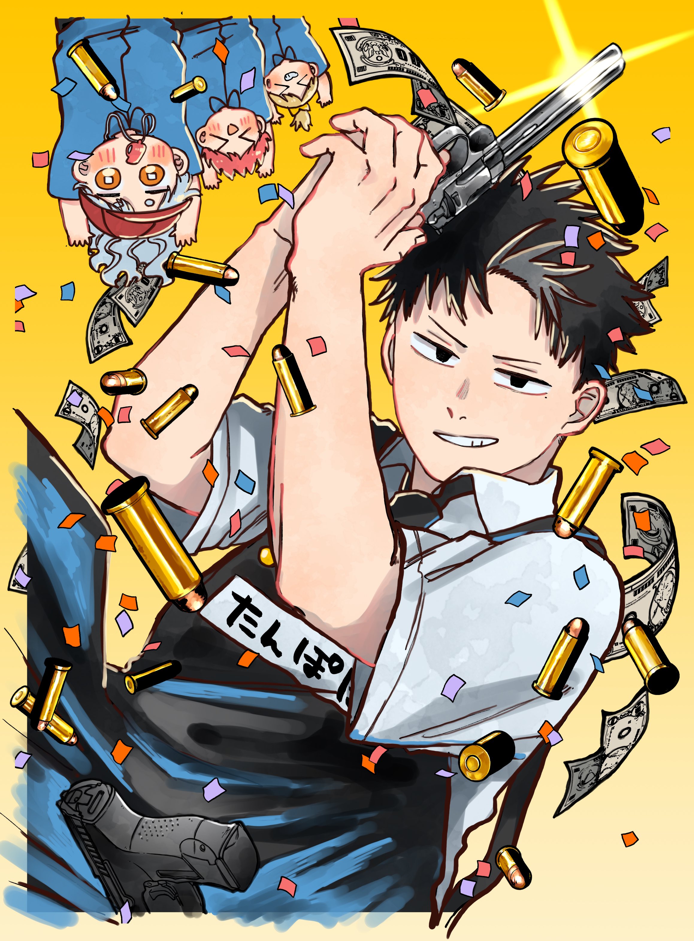 2boys 2girls absurdres apron arms_up black_apron black_eyes black_hair blonde_hair blue_shirt blue_shorts bow bullet character_request chiba_you child closed_eyes collared_shirt doug_(youchien_wars) gun hands_up happy highres looking_at_viewer lyla_(youchien_wars) money multiple_boys multiple_girls official_art open_mouth orange_hair ponytail red_hair shirt short_hair shorts smile ticket weapon whistle white_hair white_shirt yellow_background yellow_bow youchien_wars