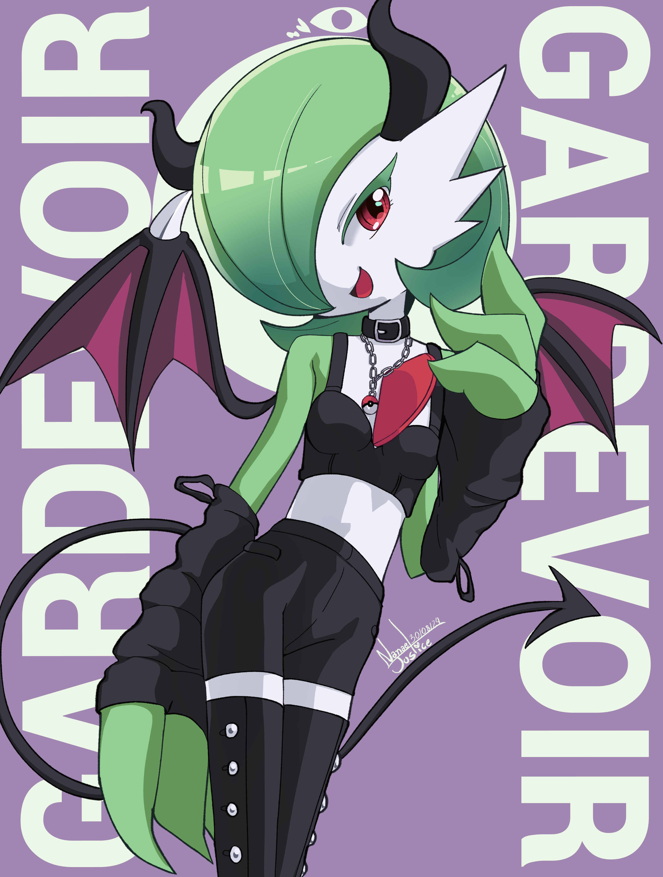 absurdres artist_name chain choker colored_skin dated demon_girl demon_horns demon_tail demon_wings gardevoir gen_3_pokemon green_hair green_skin highres horns multicolored_skin nanaeljustice nintendo poke_ball pokemon pokemon_(creature) red_eyes smile tail white_skin wings