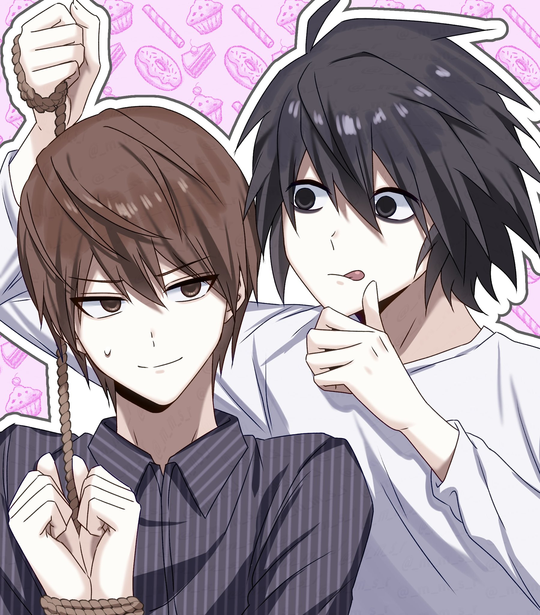 2boys arm_up black_eyes black_hair black_shirt bound bound_wrists brown_eyes brown_hair closed_mouth collared_shirt commentary_request crew_neck death_note eye_contact finger_to_mouth hair_between_eyes highres holding holding_rope l_(death_note) long_sleeves looking_at_another m_m_s_r male_focus multiple_boys rope shirt short_hair small_sweatdrop smile striped_clothes striped_shirt sweat tongue tongue_out vertical-striped_clothes vertical-striped_shirt white_shirt wing_collar yagami_light