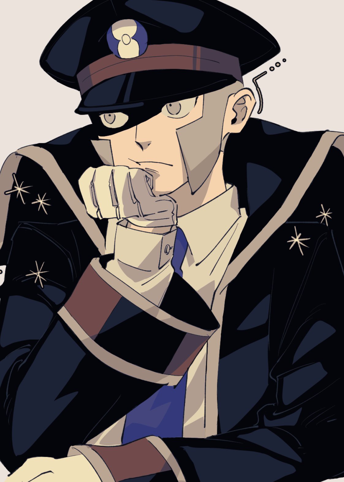 1boy :/ arm_up black_coat black_hat blue_necktie buttoned_cuffs buttons closed_mouth coat collared_shirt gloves grey_background grey_eyes grey_hair hand_on_own_face hat head_rest highres ingo_(pokemon) ins3wr long_sleeves looking_to_the_side male_focus necktie nintendo partially_shaded_face peaked_cap pokemon pokemon_bw shirt sideburns sideways_glance simple_background solo upper_body white_gloves white_shirt wide_sleeves wing_collar