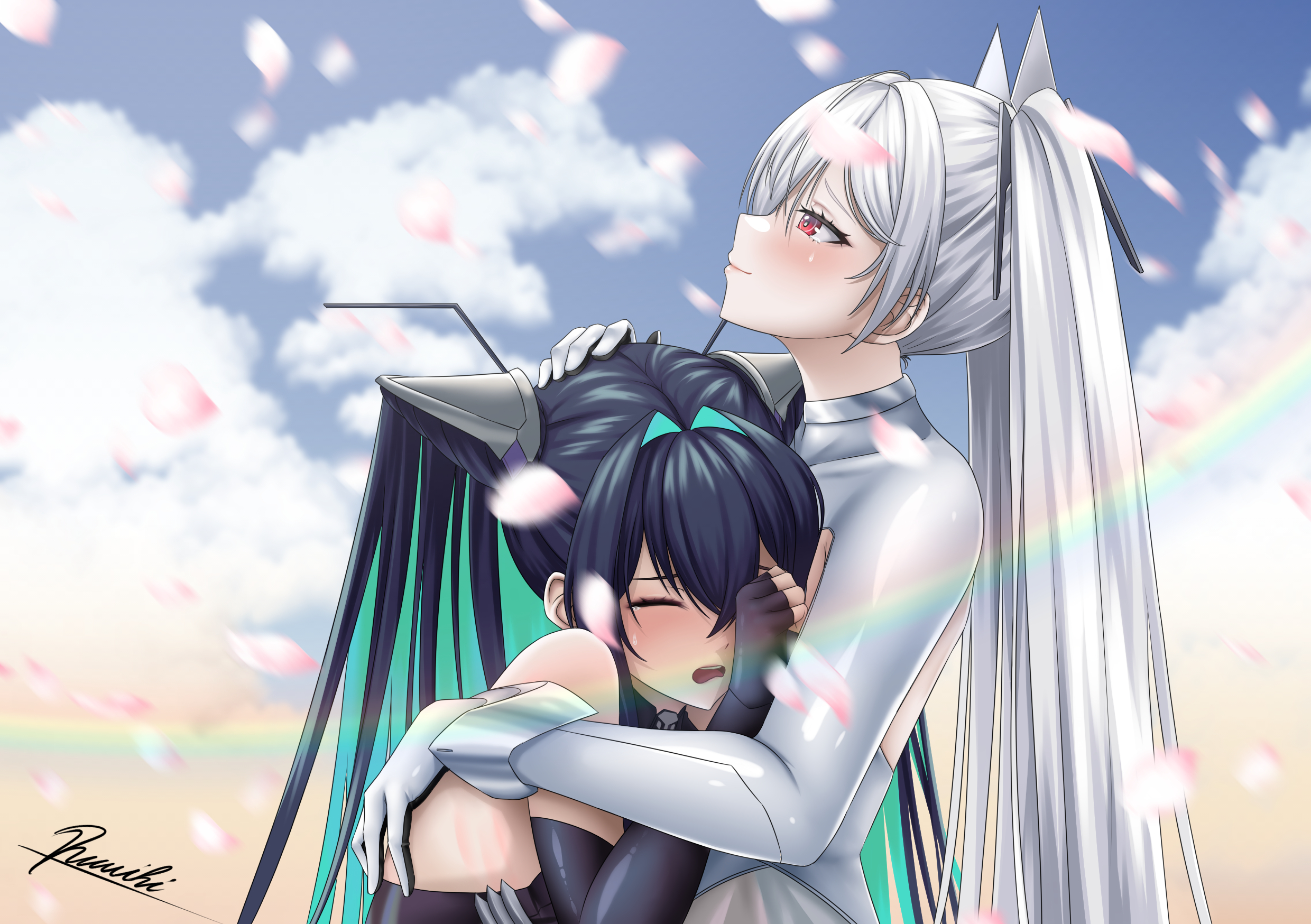 2girls aqua_hair black_hair bodysuit bun_cover cherry_blossoms cinderella_(nikke) cloud commentary commission crying crying_with_eyes_open double-parted_bangs double_bun elbow_gloves fingerless_gloves from_side gloves goddess_of_victory:_nikke hair_bun hair_ornament halterneck hand_on_another's_head highres hug little_mermaid_(nikke) long_hair looking_up multicolored_hair multiple_girls open_mouth outdoors petals pixiv_commission radio_antenna rainbow ramiki_(ramesgoag) red_eyes signature sky smile tears twintails upper_body white_hair