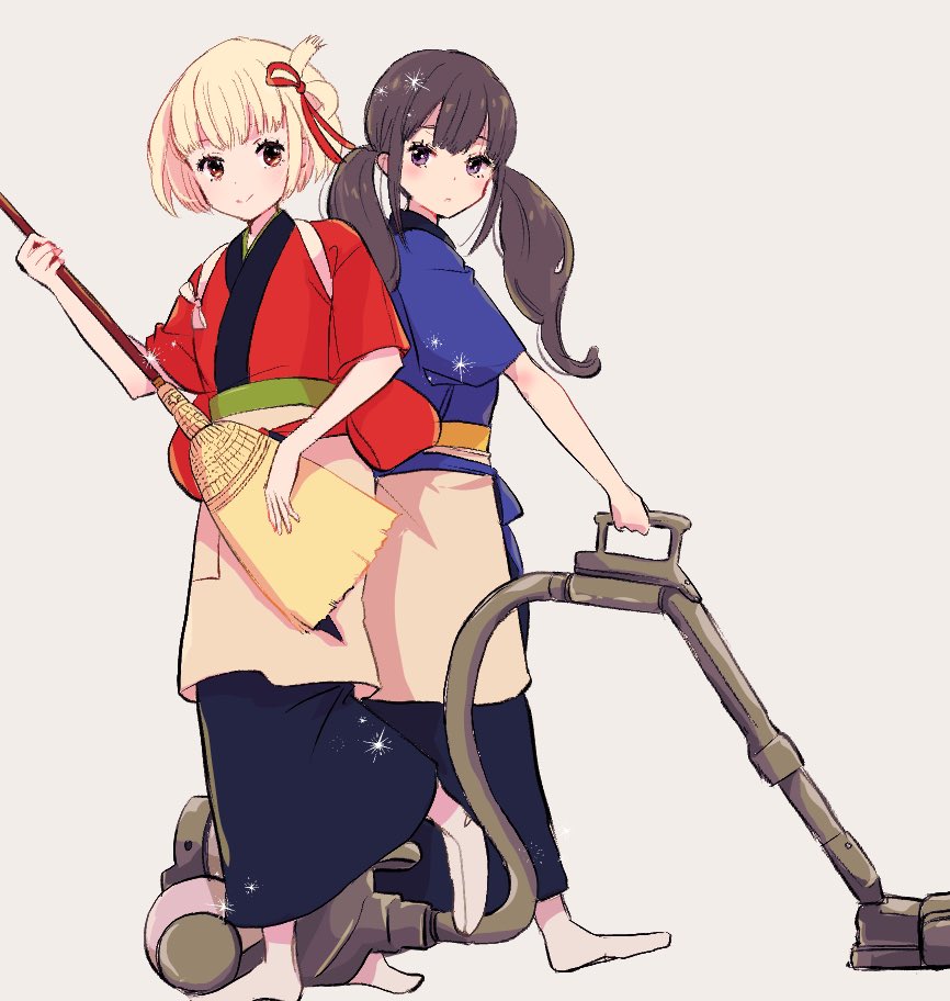 2girls air_guitar apron black_hair blonde_hair blue_kimono blunt_bangs blush bob_cut broom brown_apron brown_eyes center-flap_bangs cleaning commentary_request full_body hair_ribbon hair_rings holding holding_broom inoue_takina japanese_clothes kimono komabato_ink looking_at_viewer lycoris_recoil multiple_girls nishikigi_chisato official_alternate_costume official_alternate_hairstyle pout purple_eyes red_kimono red_ribbon ribbon short_hair sidelocks simple_background smile standing twintails vacuum_cleaner waist_apron white_background wide_sleeves
