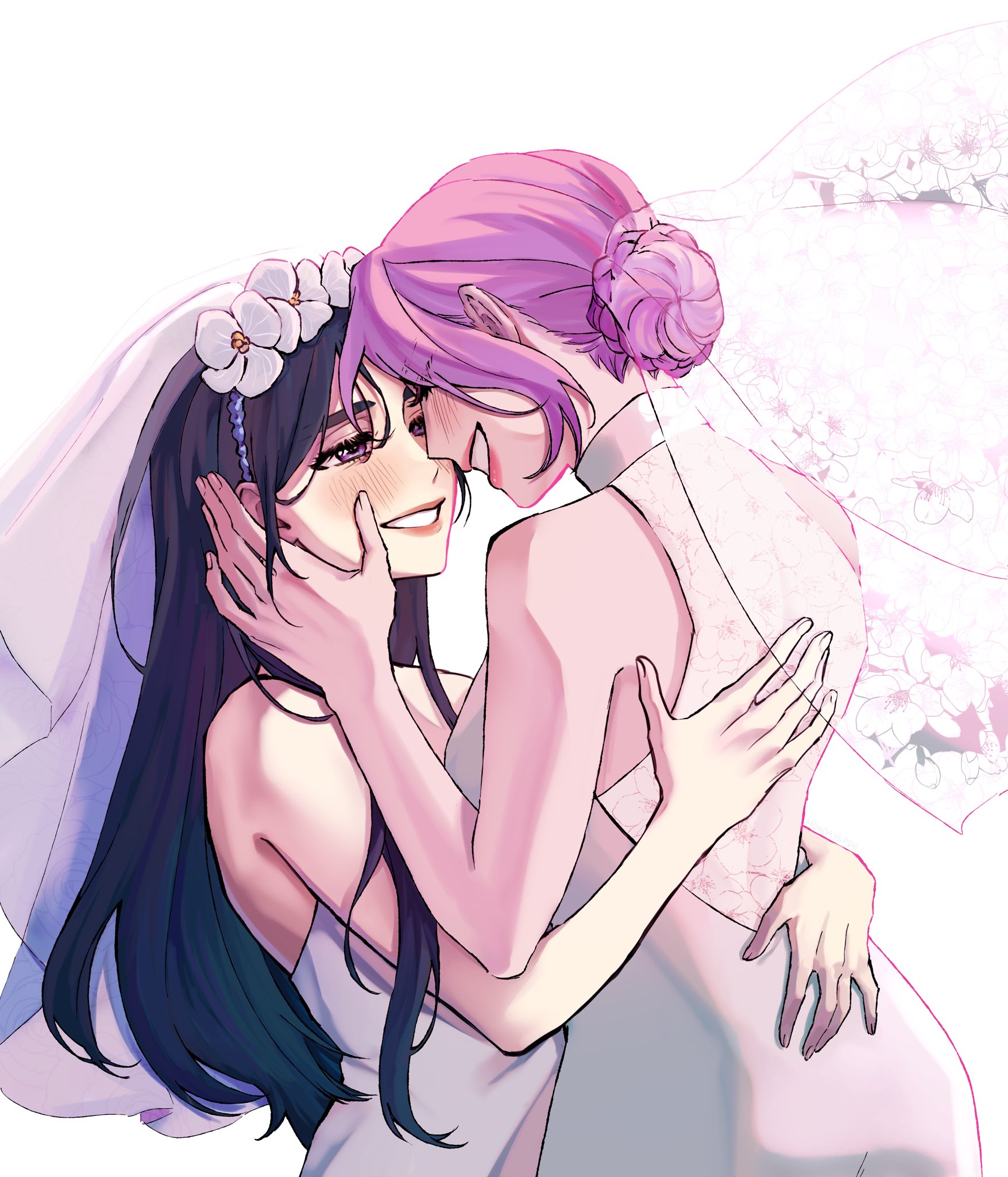2girls alien_stage bare_shoulders black_hair blush braid bridal_veil bun_with_braided_base closed_eyes commentary dress female_focus flower forehead-to-forehead grin hair_bun hair_flower hair_ornament hand_on_another's_back hand_on_another's_face heads_together highres long_hair mizi_(alien_stage) multiple_girls official_alternate_hair_length official_alternate_hairstyle pink_hair purple_eyes pyrlemon sleeveless_turtleneck_dress smile sua_(alien_stage) veil very_long_hair wedding_dress white_background white_dress white_flower white_veil wife_and_wife yuri