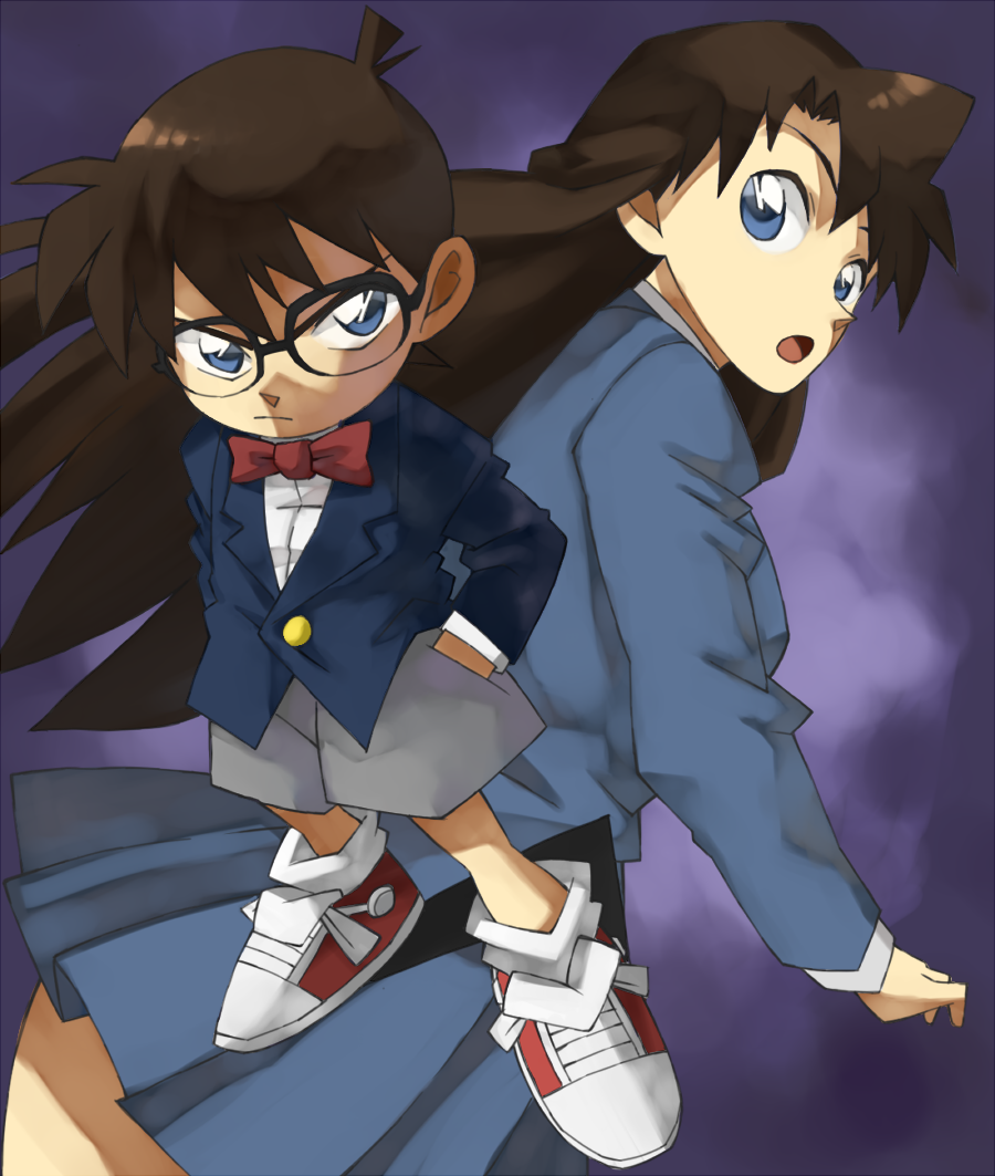 1boy 1girl black-framed_eyewear blazer blue_eyes blue_jacket blue_skirt bow bowtie brown_hair child collared_shirt commentary_request edogawa_conan glasses grey_shorts jacket long_hair long_sleeves meitantei_conan mouri_ran necktie open_mouth red_bow red_bowtie red_necktie school_uniform shino_(2919) shirt short_hair shorts skirt socks white_shirt white_socks window