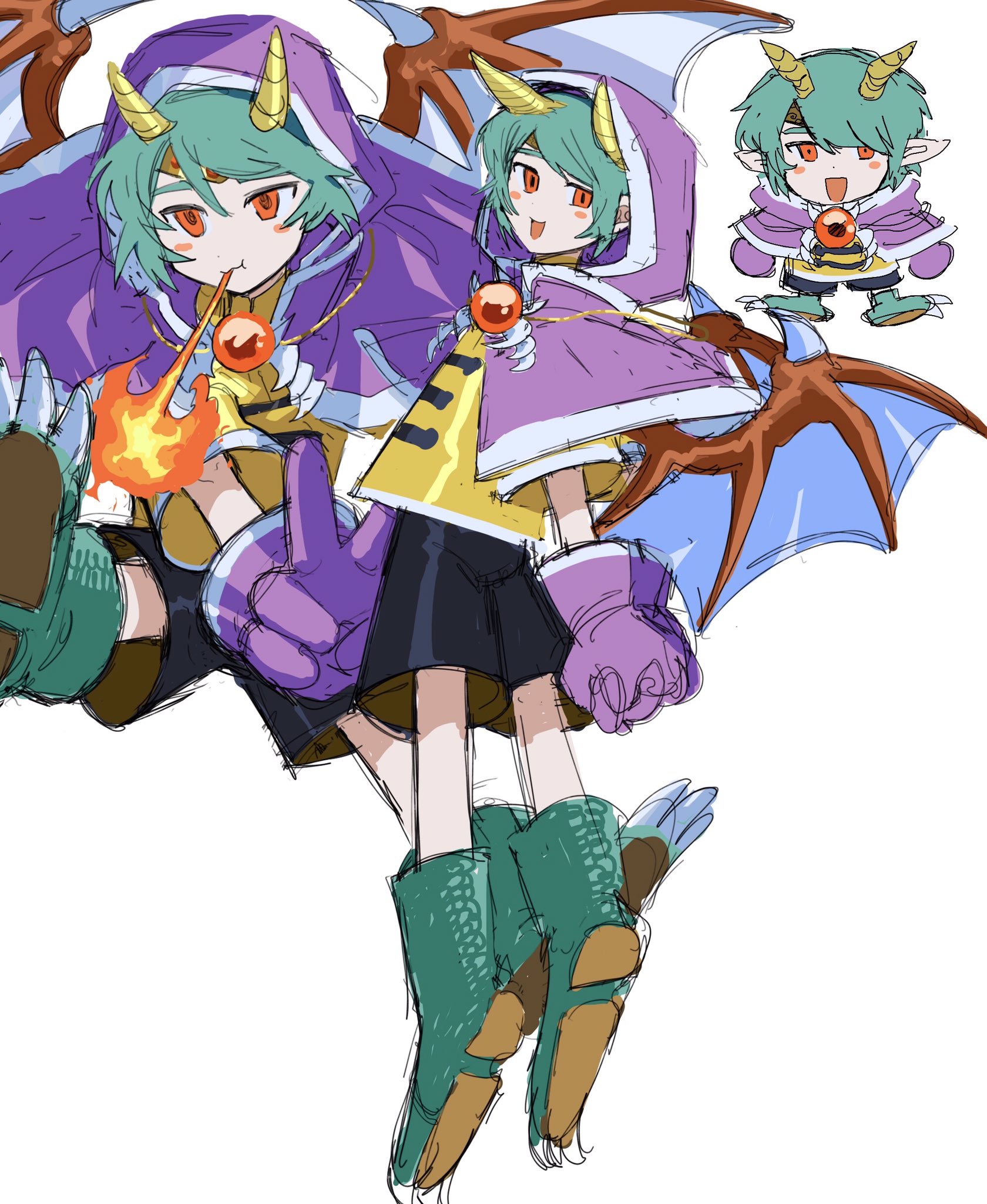 1boy breath_weapon breathing_fire capelet dragon_boy dragon_horns dragon_wings fire flying full_body gloves green_hair highres hood hood_up hooded_capelet horns ichiruho looking_at_viewer looking_back male_focus multiple_views orange_eyes original paw_shoes purple_capelet purple_gloves shirt short_hair shorts simple_background white_background wings yellow_shirt