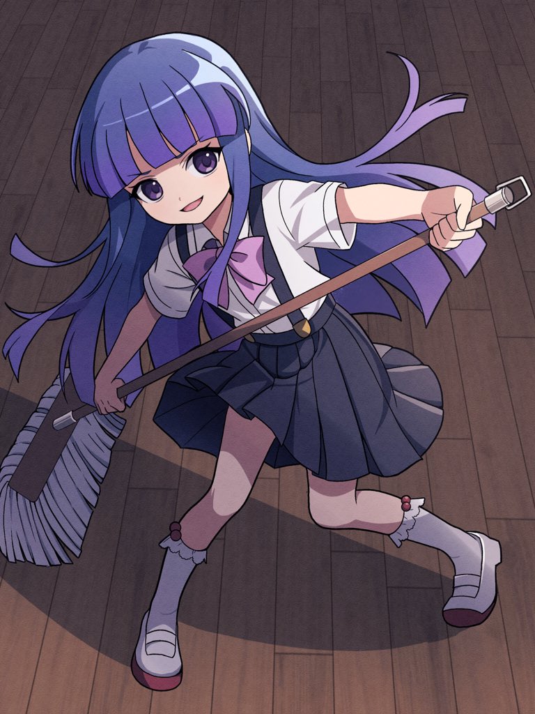 1girl :d black_skirt blunt_bangs blunt_ends bow bowtie commentary fighting_stance floating_hair full_body furude_rika higurashi_no_naku_koro_ni hime_cut holding holding_mop indoors kneehighs long_hair looking_at_viewer mop niyane open_mouth pink_bow pink_bowtie pleated_skirt purple_eyes purple_hair shirt short_sleeves sidelocks skirt smile socks solo standing suspender_skirt suspenders v-shaped_eyebrows white_shirt white_socks wooden_floor