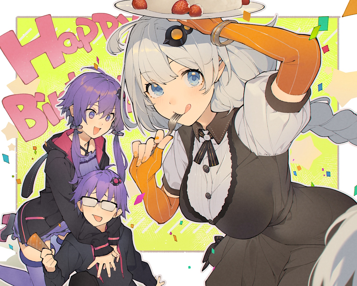 1boy 2girls :q black_hoodie blue_eyes bracelet braid brother_and_sister commentary_request confetti elbow_gloves facing_viewer fingerless_gloves food fork fruit glasses gloves grey_hair hair_ornament happy_birthday highres holding holding_fork holding_party_popper holding_tray hood hood_down hoodie jewelry kizuna_akari looking_at_viewer multiple_girls nail_polish opaque_glasses open_mouth orange_gloves orange_nails party_popper pinstripe_gloves puffy_short_sleeves puffy_sleeves purple_eyes purple_hair shirinda_fureiru short_sleeves siblings strawberry tongue tongue_out tray vocaloid voiceroid yuzuki_yukari yuzuki_yukari's_younger_twin_brother