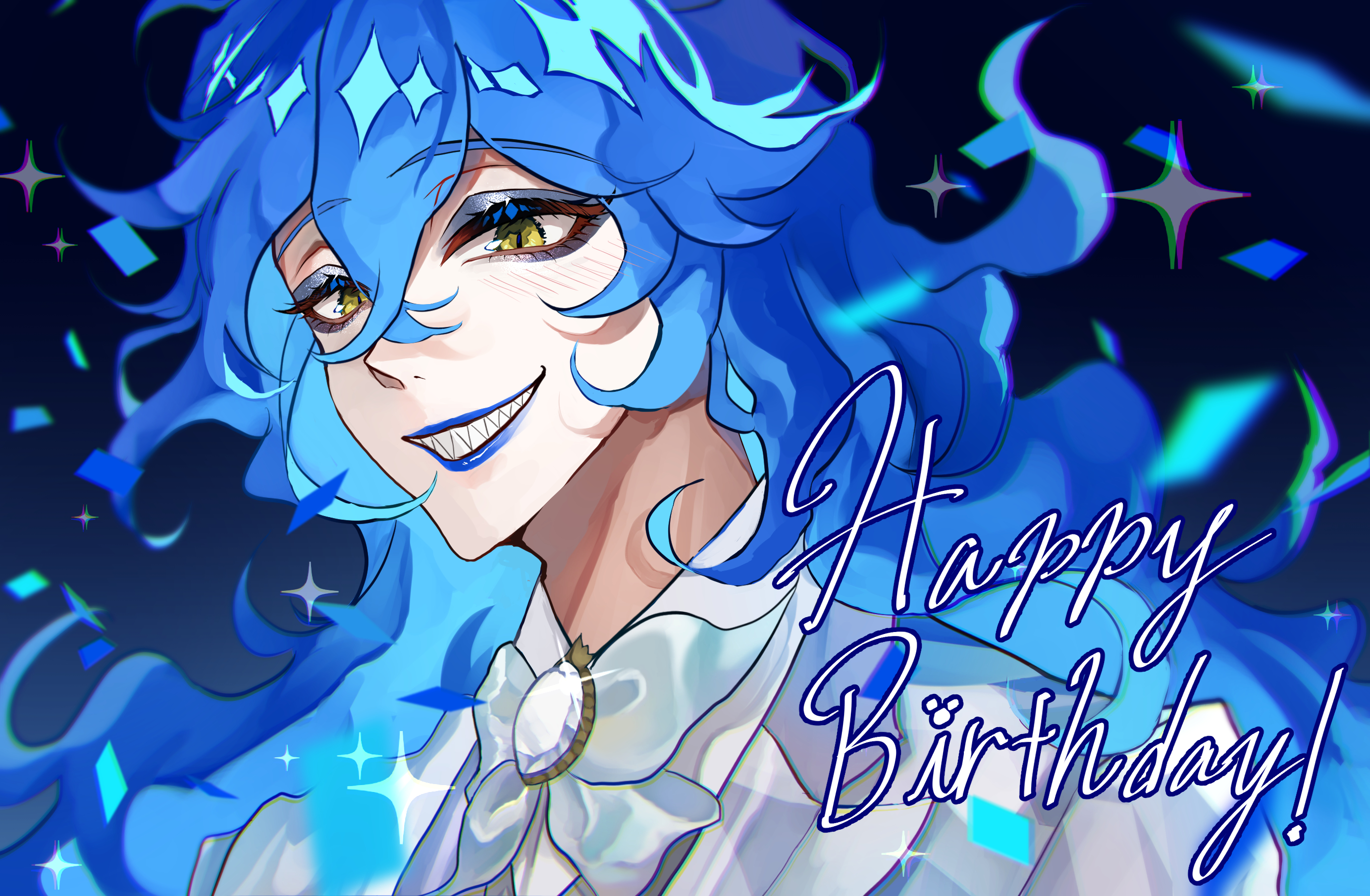 1boy black_background blue_background blue_eyeshadow blue_hair blue_lips bow bowtie brooch collared_shirt eyeshadow gem gradient_background grin hair_between_eyes happy_birthday highres idia_shroud jacket jewelry long_hair looking_at_viewer makeup male_focus mememe_(xufoge9) multicolored_background portrait sharp_teeth shirt simple_background smile solo sparkle teeth twisted_wonderland upper_body white_bow white_gem white_jacket white_shirt wing_collar yellow_eyes