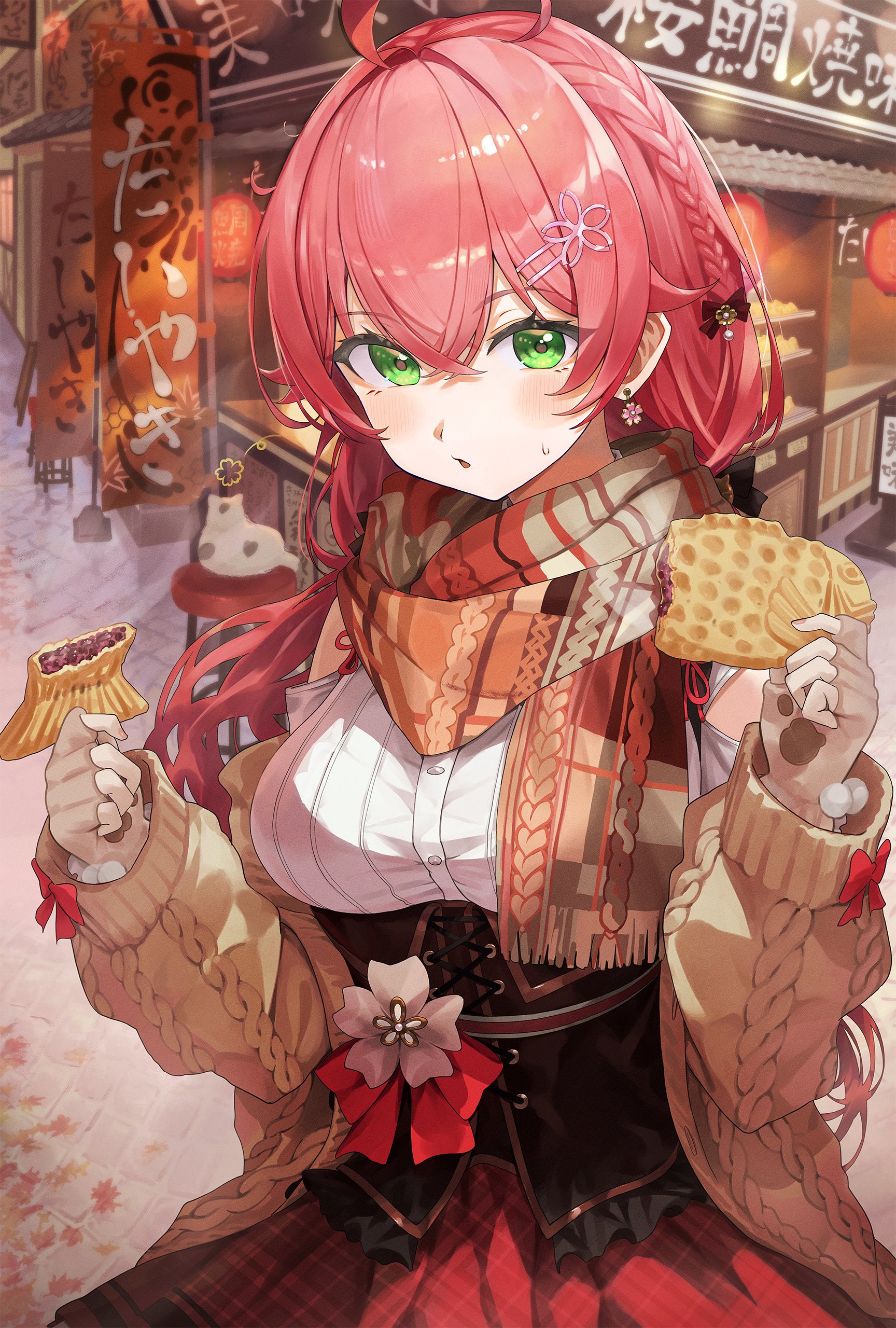 1girl :o absurdres ahoge atatatatame01 blush bodice braid breasts brown_gloves cardigan cat clothing_cutout earrings fingerless_gloves flower flower_earrings food gloves green_eyes hair_between_eyes hair_flower hair_ornament hairclip highres holding holding_food hololive jewelry large_breasts long_hair long_sleeves looking_at_viewer official_alternate_costume open_cardigan open_clothes outdoors plaid_clothes plaid_skirt pleated_skirt red_skirt sakura_miko sakura_miko_(casual) scarf shirt shoulder_cutout skirt solo sweatdrop taiyaki virtual_youtuber wagashi white_shirt yellow_cardigan