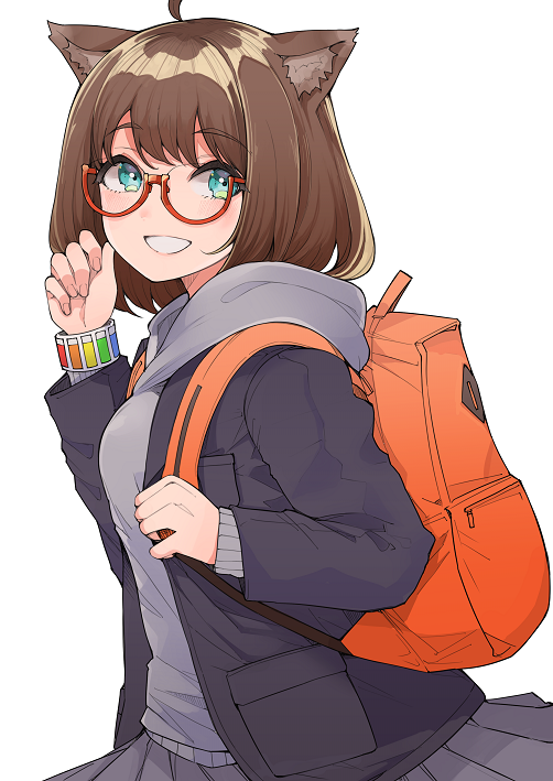 1girl ahoge animal_ear_fluff animal_ears backpack bag black_jacket blazer blue_eyes bob_cut breasts brown_hair commentary_request commission goten_(510gensoku) grey_hoodie grey_skirt grin hair_between_eyes hood hoodie jacket jacket_over_hoodie open_clothes open_jacket original pocket red-framed_eyewear school_uniform second-party_source semi-rimless_eyewear simple_background skeb_commission skirt smile solo standing under-rim_eyewear white_background