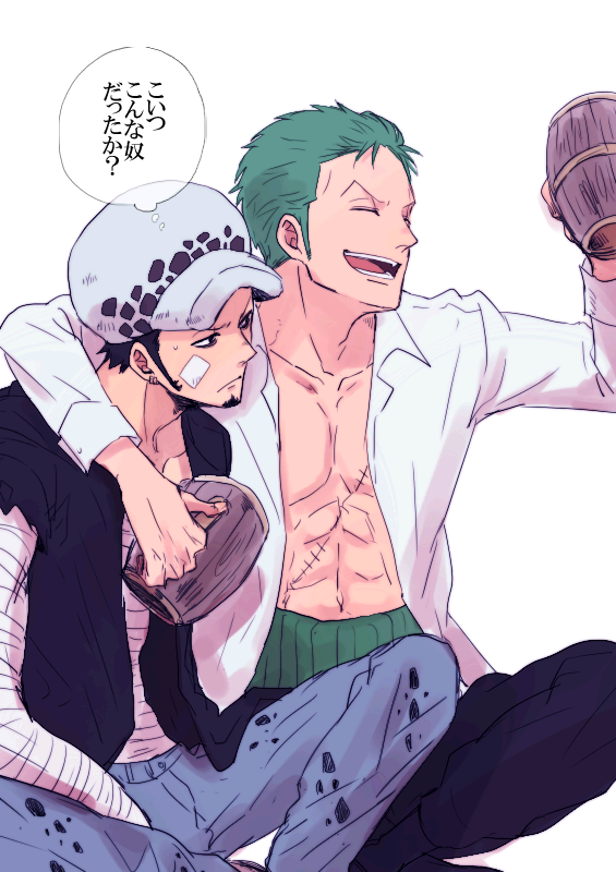 2boys ^_^ abs bandaged_arm bandaged_torso bandages bandaid bandaid_on_face black_hair closed_eyes commentary_request cup denim facial_hair goatee green_hair haramaki hat holding holding_cup jeans multiple_boys one_piece open_mouth pants roronoa_zoro shirt short_hair sideburns simple_background speech_bubble stitched_torso stitches trafalgar_law translation_request white_background white_shirt zattsu_(morte)
