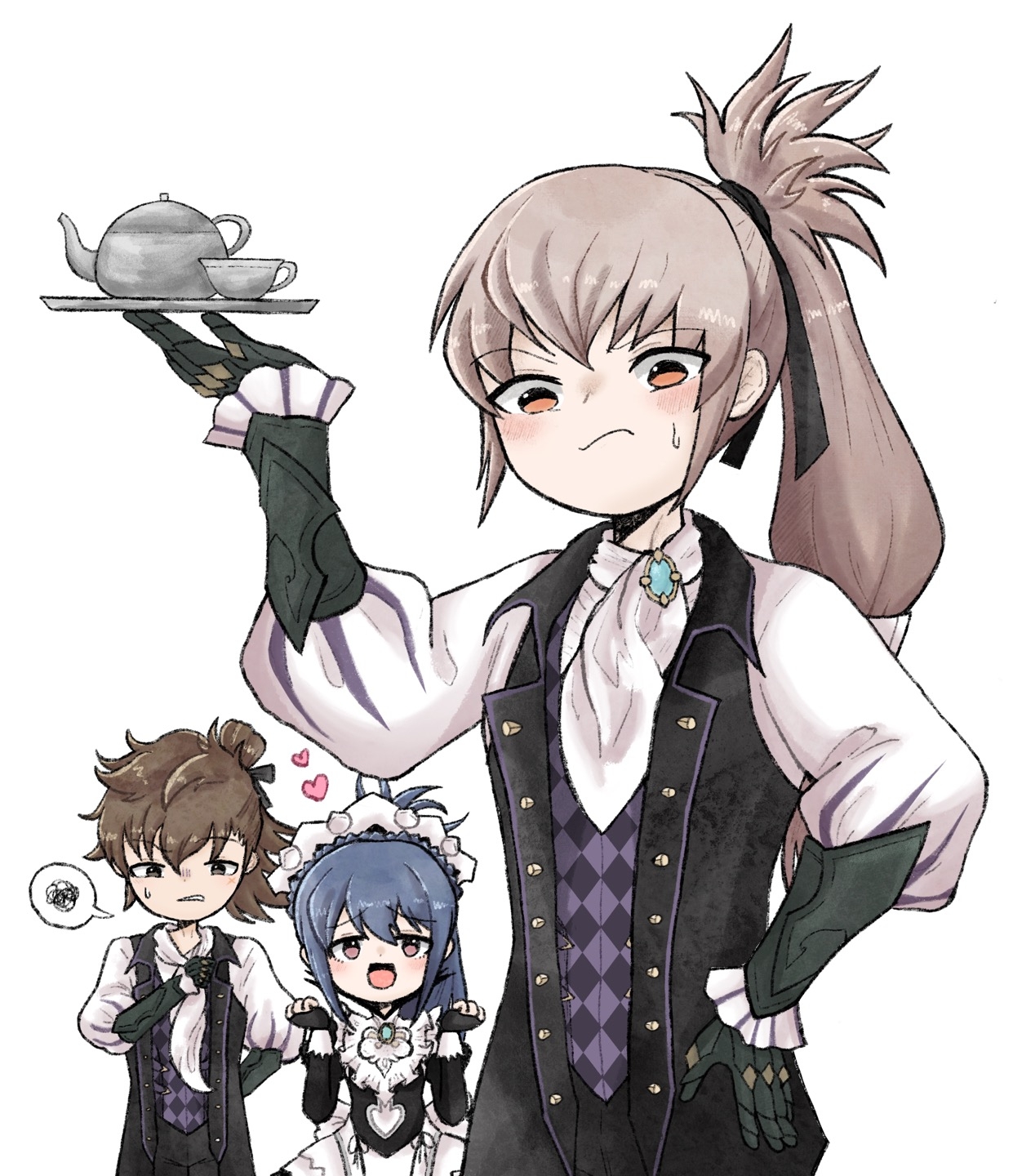 1girl 2boys alternate_costume apron black_bridal_gauntlets black_dress black_feathers bridal_gauntlets butler cosplay cup dress feather_trim feathers fire_emblem fire_emblem_fates grey_hair hair_ribbon highres hinata_(fire_emblem) holding holding_tray jakob_(fire_emblem) jakob_(fire_emblem)_(cosplay) jatarism07 maid_(fire_emblem) maid_(fire_emblem)_(cosplay) maid_apron maid_headdress multiple_boys nintendo oboro_(fire_emblem) ribbon takumi_(fire_emblem) tea_set teacup teapot tray white_apron white_wrist_cuffs wrist_cuffs