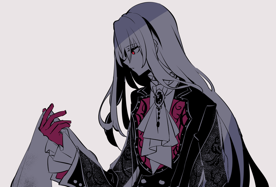 1boy closed_mouth frilled_shirt_collar frilled_sleeves frills hand_up holding long_hair looking_at_hand mahoutsukai_no_yakusoku monochrome oz_(mahoutsukai_no_yakusoku) red_eyes sks46mh solo very_long_hair