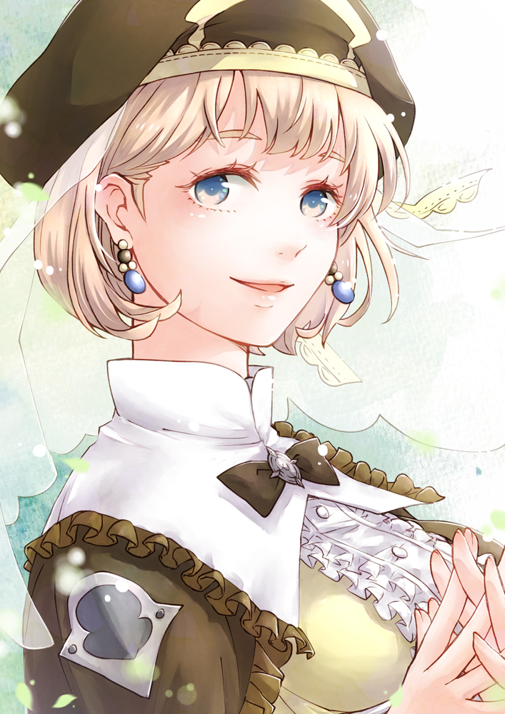 1girl blonde_hair blue_eyes bow bowtie brown_bow brown_bowtie brown_hat commentary_request earrings ebi_puri_(ebi-ebi) eyelashes fire_emblem fire_emblem:_three_houses frills hat interlocked_fingers jewelry mercedes_von_martritz mercedes_von_martritz_(timeskip) nintendo open_mouth short_hair solo upper_body veil