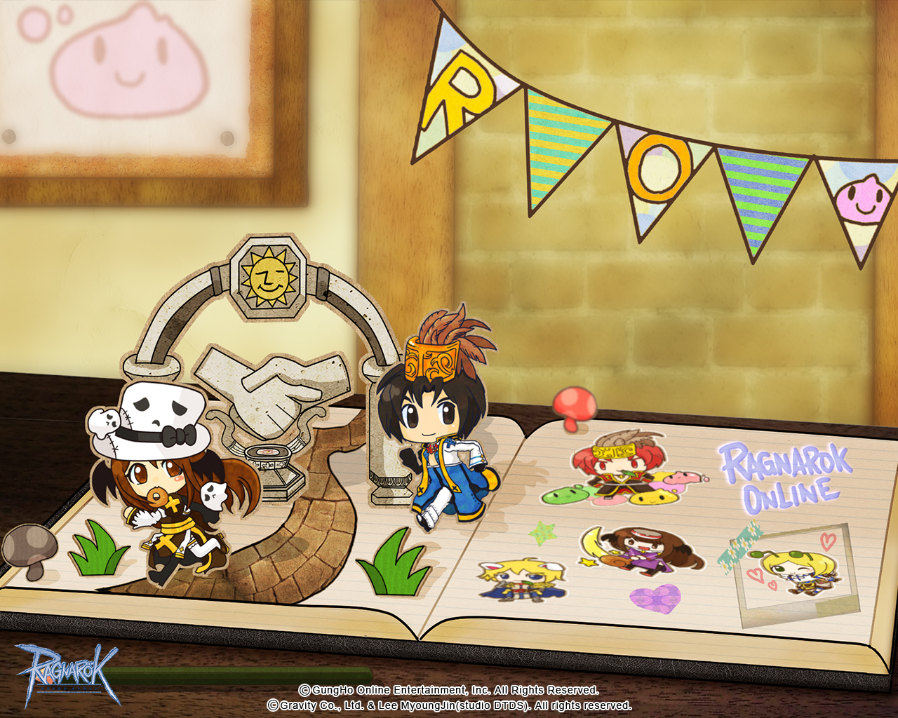 1boy 1girl arch_bishop_(ragnarok_online) black_bow black_eyes black_footwear black_gloves black_hair black_wings blue_coat book bow brown_dress brown_eyes brown_hair chibi chibi_only closed_mouth coat copyright_notice cropped_jacket cross cross_of_prontera crown crusader_(ragnarok_online) dress drops_(ragnarok_online) fingerless_gloves full_body gloves grass guest_art hat hat_bow head_wings headdress imo-mode jacket logo long_hair long_sleeves mushroom official_art official_wallpaper open_book painting_(object) pants pencil poporing poring priest_(ragnarok_online) ragnarok_online running sash shoes short_hair smile statue streamers super_novice_(ragnarok_online) thighhighs top_hat whisper_(ragnarok_online) white_hat white_jacket white_pants white_thighhighs wings yellow_sash