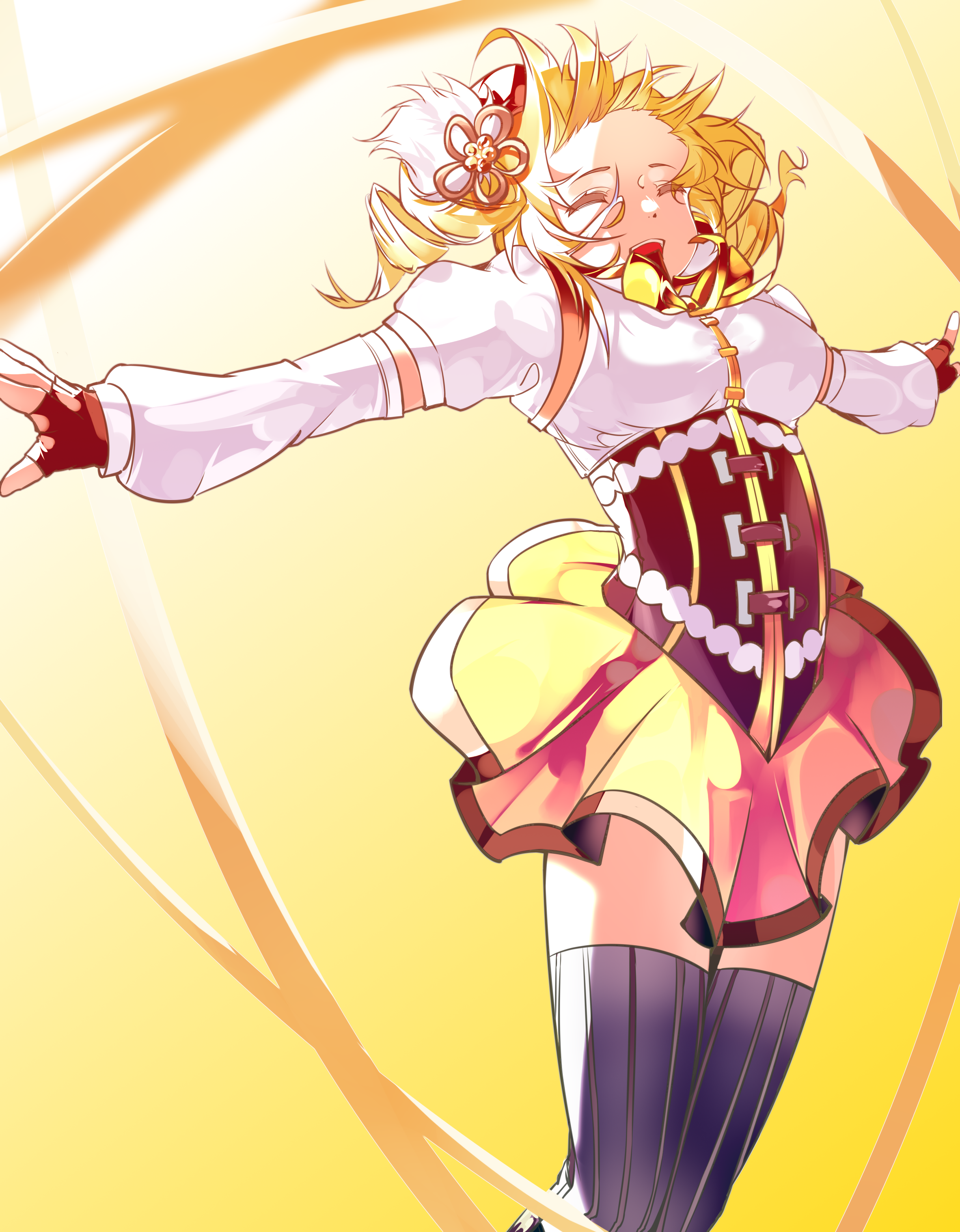 1girl ^_^ absurdres beret black_corset black_gloves black_hat black_thighhighs blonde_hair bow bowtie chinese_commentary closed_eyes commentary_request corset cowboy_shot detached_sleeves drill_hair eyelashes fingerless_gloves floating_clothes floating_hair flower_hairpin gem gloves gradient_background hat hat_feather highres kyrimaru2 long_hair long_sleeves magical_girl mahou_shoujo_madoka_magica mahou_shoujo_madoka_magica_(anime) miniskirt open_mouth outstretched_arms pleated_skirt puffy_long_sleeves puffy_short_sleeves puffy_sleeves ribbon shirt short_sleeves skirt smile solo striped_clothes striped_thighhighs teeth thighhighs tomoe_mami tomoe_mami_(magical_girl) twin_drills upper_teeth_only vertical-striped_clothes vertical-striped_thighhighs white_shirt white_sleeves yellow_background yellow_bow yellow_bowtie yellow_gem yellow_ribbon yellow_skirt