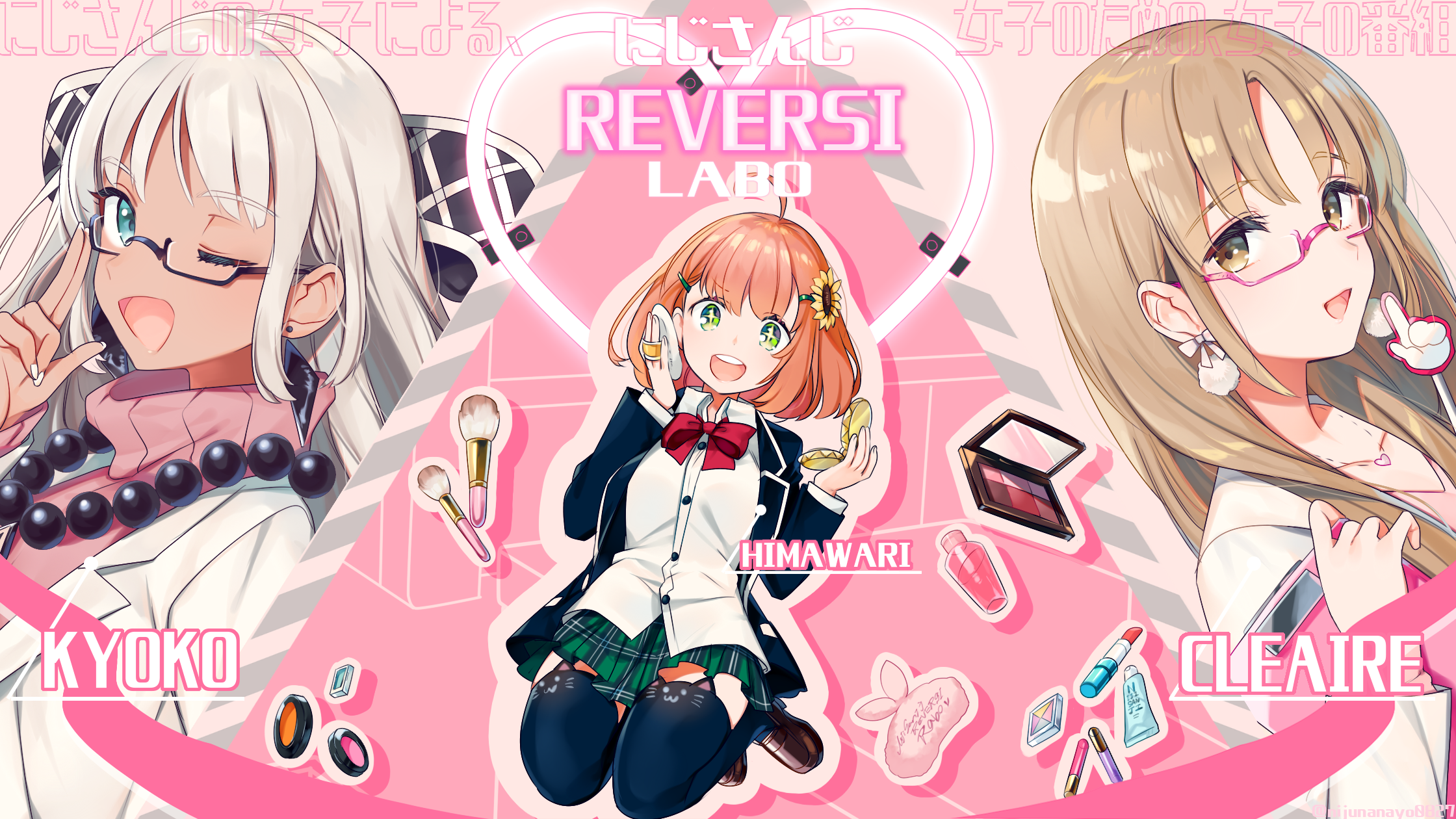 +_+ 3girls :d ;d animal_ear_legwear black_thighhighs blue_eyes blue_jacket bow brown_eyes brown_footwear brown_hair cat_ear_legwear character_name collarbone collared_shirt dress_shirt flower glasses green_eyes green_skirt grey_hair hair_flower hair_ornament hairclip hand_mirror heart highres honma_himawari honma_himawari_(1st_costume) jacket lipstick loafers long_hair long_sleeves makeup makeup_brush mirror multiple_girls nijisanji ninahachi one_eye_closed open_clothes open_jacket open_mouth orange_hair pink_shirt pink_sweater pleated_skirt powder_puff purple-tinted_eyewear red_bow school_uniform semi-rimless_eyewear shirt shoes sister_claire skirt smile sunflower sunflower_hair_ornament sweater thighhighs tinted_eyewear todoroki_kyouko todoroki_kyouko_(2nd_costume) translation_request turtleneck turtleneck_sweater under-rim_eyewear virtual_youtuber white_jacket white_shirt yellow_flower