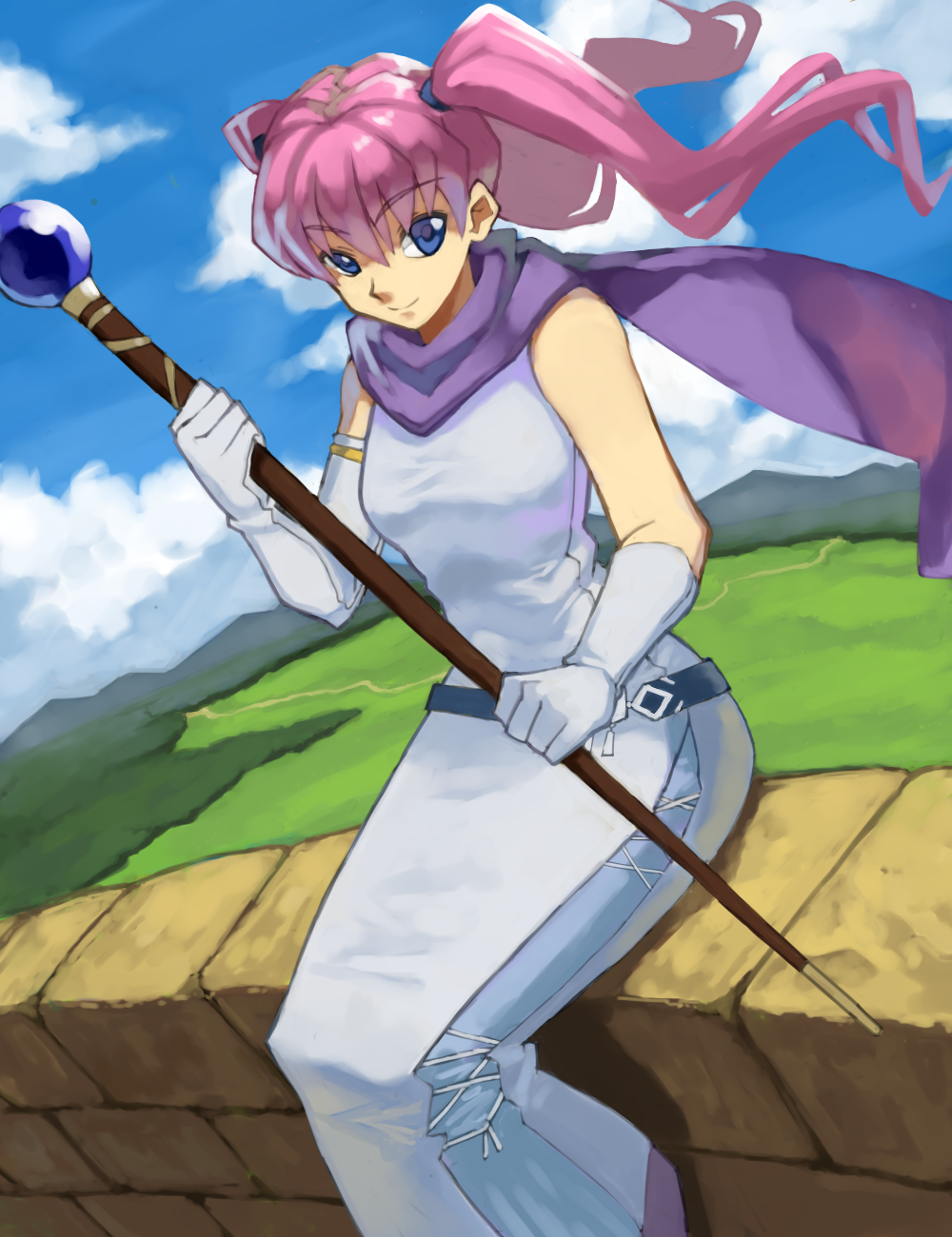 1girl breasts closed_mouth commentary_request dress elbow_gloves fire_emblem fire_emblem:_the_blazing_blade gloves hair_behind_ear highres holding holding_staff looking_at_viewer medium_breasts nintendo purple_hair serra_(fire_emblem) shino_(2919) sitting smile solo staff twintails white_dress white_gloves