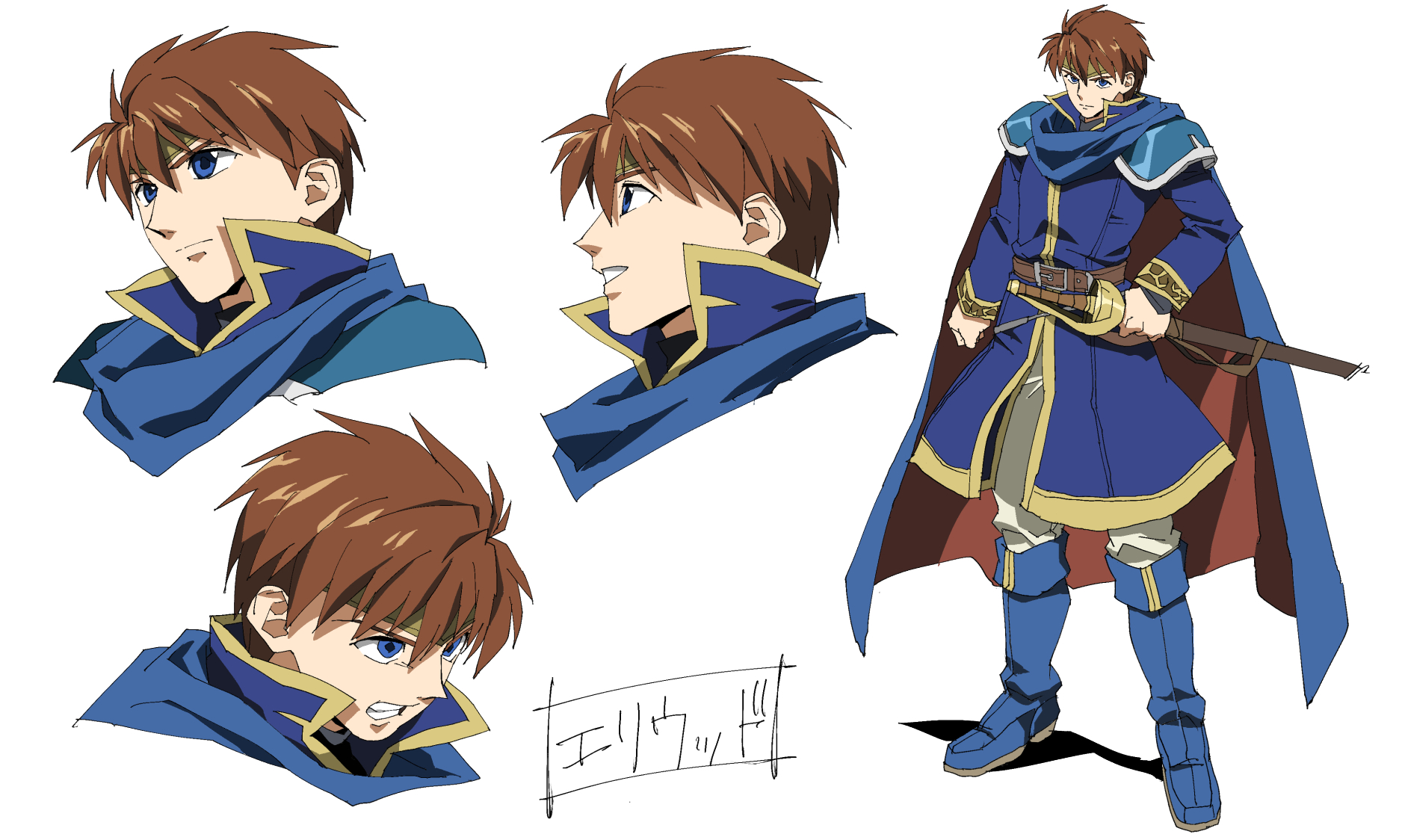1boy armor belt blue_eyes boots cape reference_sheet commentary_request eliwood_(fire_emblem) fire_emblem fire_emblem:_the_blazing_blade highres holding holding_sword holding_weapon jacket male_focus multiple_views nintendo pants red_hair sheath shino_(2919) shirt short_hair smile sword weapon