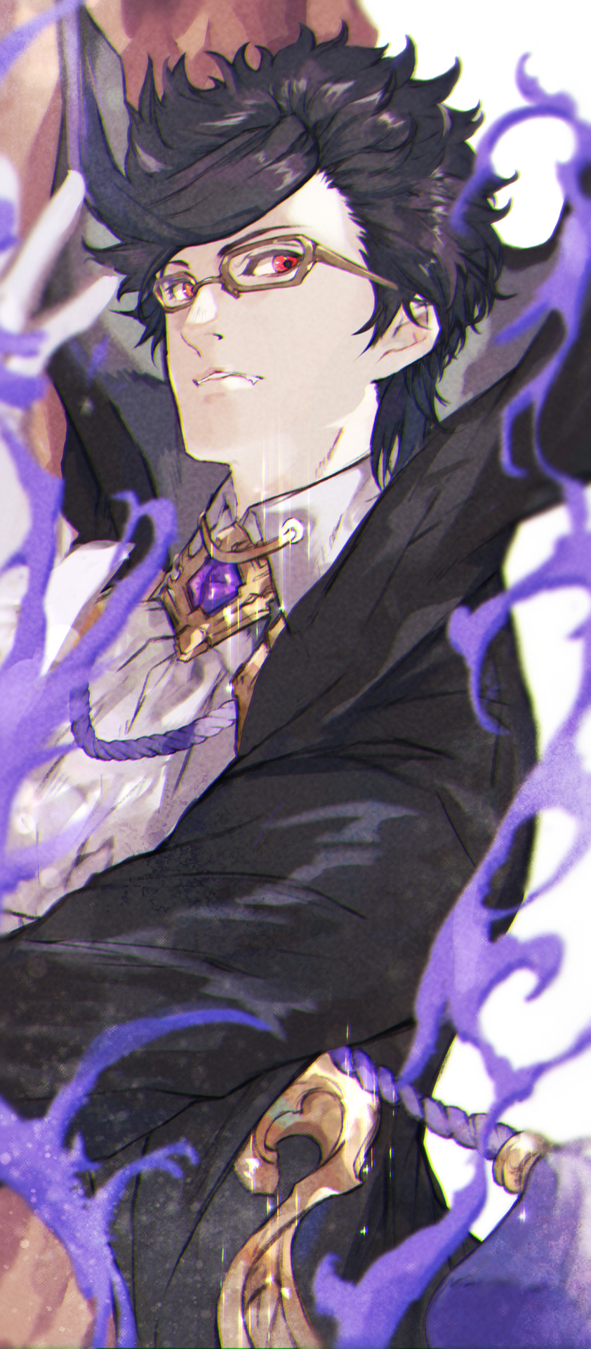 1boy aura bad_id bad_skeb_id bad_tumblr_id black_hair coat collared_shirt commission fang formal_clothes gloves glowing glowing_eyes hair_between_eyes hameln_(sinoalice) highres looking_at_viewer male_focus multicolored_hair owalioli pendant_choker red_eyes shirt short_hair simple_background sinoalice skeb_commission solo tassel two-tone_hair vampire white_background white_gloves