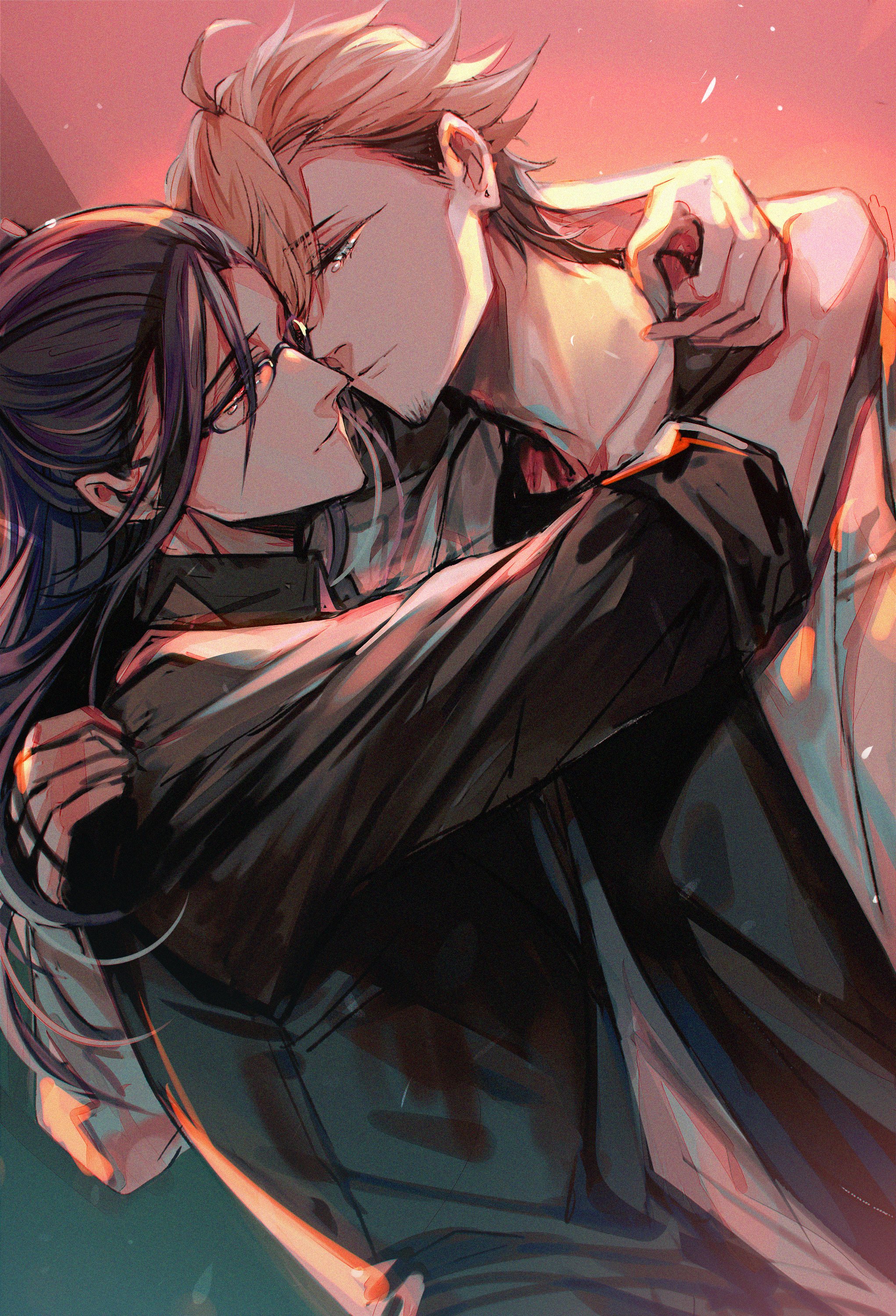 2boys absurdres ahoge aladdin_(sinoalice) beard black-framed_eyewear black_hair black_shirt blonde_hair closed_mouth collared_shirt commission couple coxxco12 face-to-face facial_hair glasses hameln_(sinoalice) highres hug jacket looking_at_another male_focus medium_hair multicolored_hair multiple_boys petals ponytail reality_arc_(sinoalice) red_eyes second-party_source shirt sidelocks sinoalice skeb_commission sky sleeves_rolled_up smile sunset teacher two-tone_hair vest white_jacket white_petals yaoi