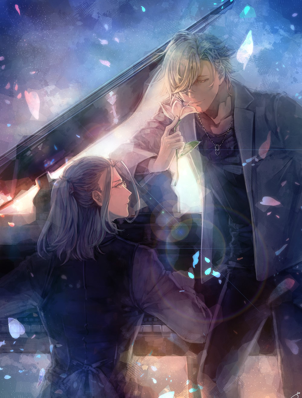 2boys aladdin_(sinoalice) beard black-framed_eyewear black_hair black_pants blonde_hair blue_eyes closed_mouth collared_shirt commission facial_hair falling_petals flower glasses grey_shirt hameln_(sinoalice) highres holding holding_flower implied_yaoi instrument jacket jewelry kino_cozi lens_flare light_smile looking_at_another male_focus medium_hair multiple_boys music necklace pants petals piano playing_instrument playing_piano ponytail reality_arc_(sinoalice) red_eyes ring second-party_source shirt single_sidelock sinoalice skeb_commission sleeves_rolled_up teacher vest white_flower white_jacket